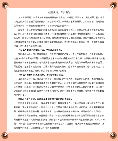 为进一步丰富我院研究生居家学习生活,提升研究生人文素养和综合能力,在全国人民齐心抗疫之际,学院特此举办“抗疫青春,有所作为”研究生主题征文大赛。