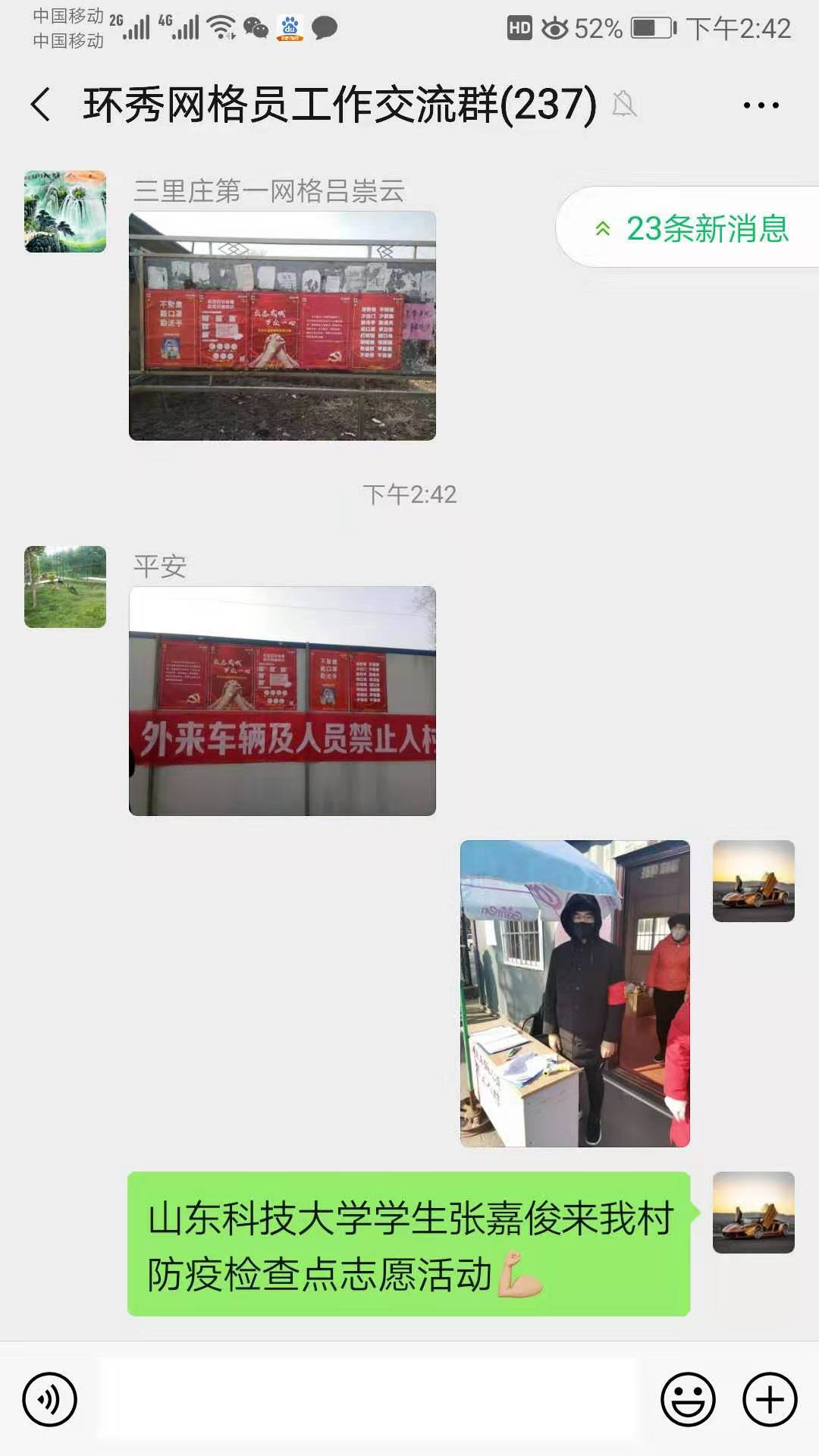 2月3日,物联网工程19-2班的张嘉峻在青岛市即墨区环秀街道办事处庙头村,开始了为期五天半的疫情志愿服务工作。天气冷、时间长,但张嘉峻从不抱怨半分。张嘉峻每天的工作就是对出入该地区的人员进行体温检测,及时提醒及劝导想要外出的人员,多方面的配合工作人员打好这场疫情阻击战。