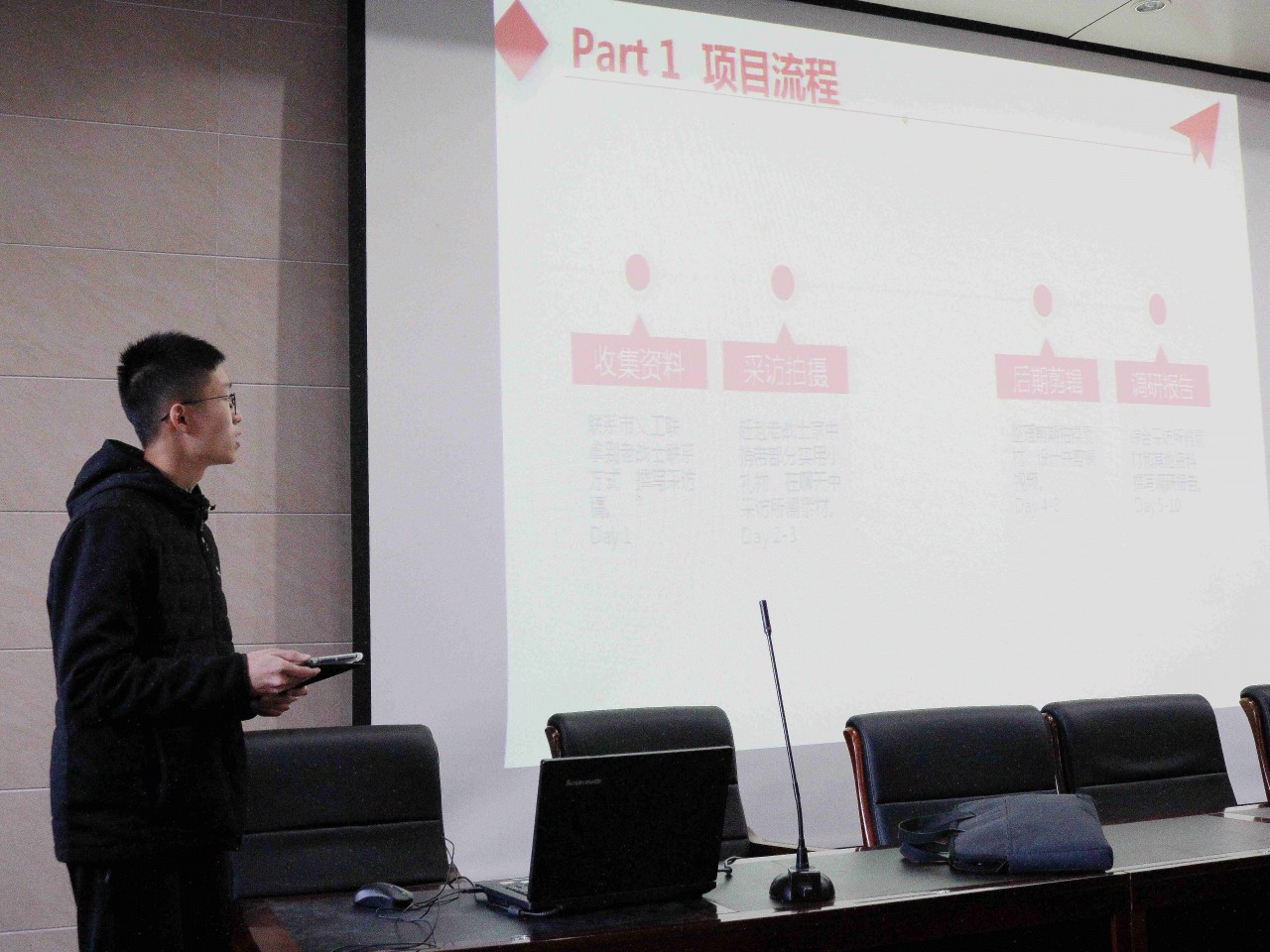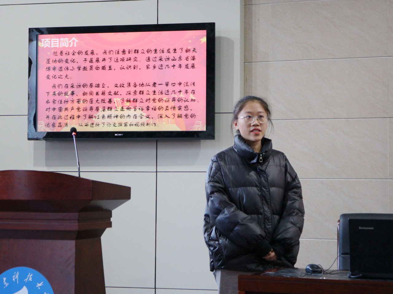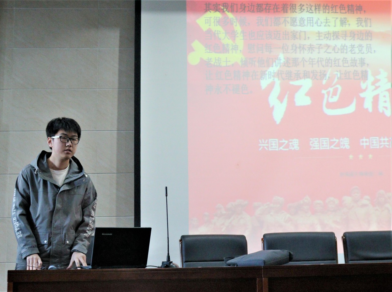 红动团队、红旗团队、革命小队、杨铭哲、不忘初心团队的5位参赛团队代表依次分别上台介绍其团队所研究的项目及研究的目的。负责人利用多媒体向在座的评委老师及众多同学讲述实践故事、分享实践感受、展示部分调查采访,后期处理过程的记录与撰写论文时的图片,不光表现出老一辈革命者和建设者对党的追随与拥护,更表现当代青年对党的坚定信仰。他们的展示让评委老师与同学们看到他们的付出,这为所有同学树立起好的榜样,提高了同学们参加社会实践活动的积极性,也让更多学子了解并深深地感受到了红色精神。