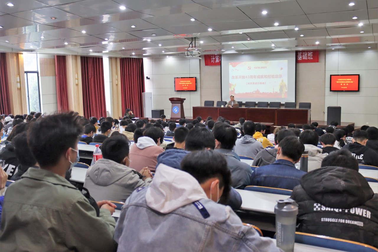 郝亮首先从经典歌曲《春天的故事》切入,用声音唤醒同学们对于改革开放的认识。接着,郝书记从改革开放的背景、发展历程、重大成就、经验和不足以及新时代如何看待改革开放等五个方面,结合时代背景、具体事例对改革开放进行了详细解读。他提到,改革开放以来,中国已经从商品经济、市场经济、信息经济转向高度发展的数字经济,交通运输建设取得辉煌成就,人民生活水平大幅提高,不论是“草鞋”“供销社”“的确良”,还是“彩照”“九年义务教育”,亦或 “墨子号”“北斗”“天眼”“核潜艇”,都是国家43年沧桑巨变的见证。即使国际环境风云变幻,新冠疫情蔓延带来了经济下行的压力,我国经济长期向好的基本面没有改变。郝书记总结到,四十多年来的改革进程给我们带来的不仅仅是方法论上的经验,也在坚守市场经济主体平等的理念,以及坚持改革为了人民、依靠人民、改革成果由人民共享的价值观上给予我们深刻的启示。