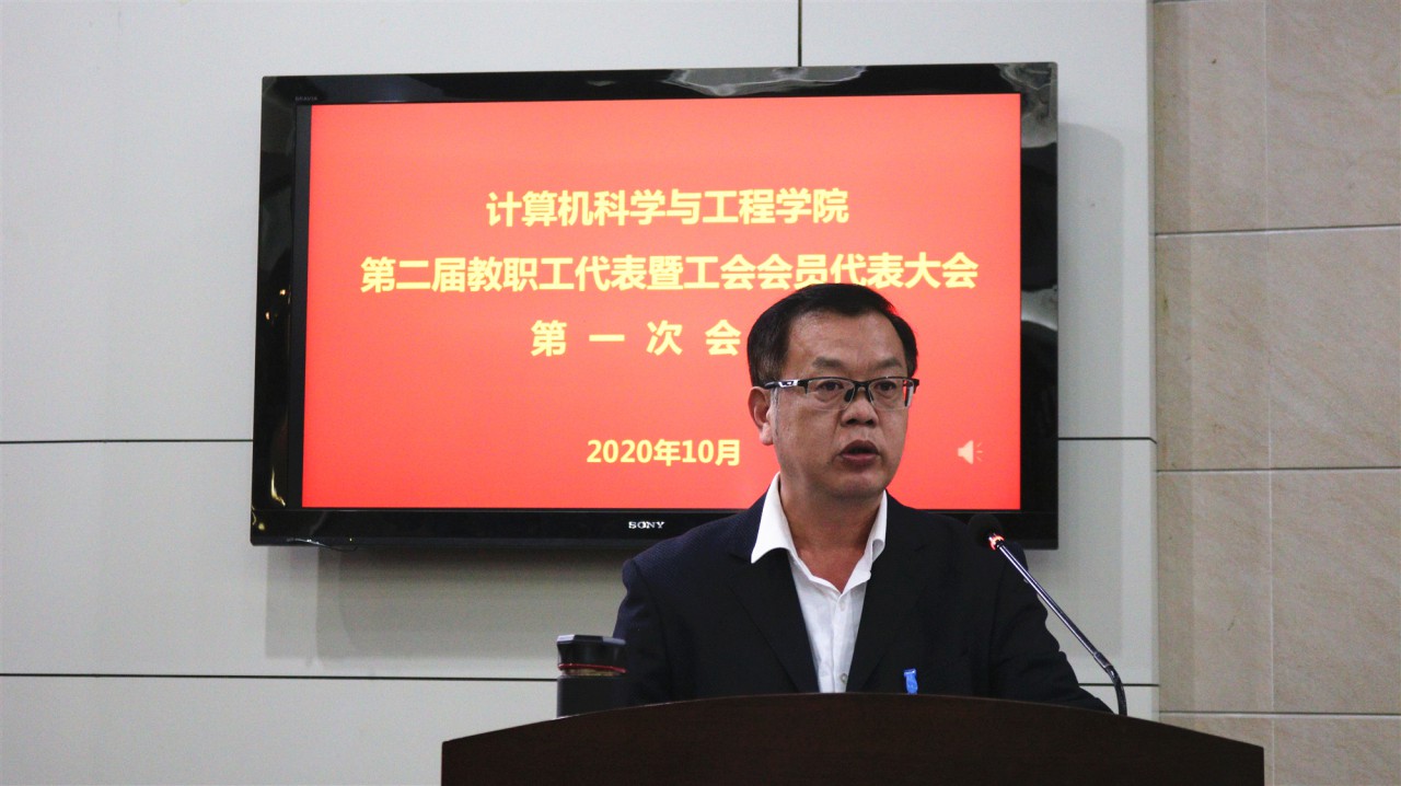 2020年10月27日,计算机学院第二届教职工代表暨工会会员代表大会第一次会议在蓝光报告厅召开。学院党委书记牟仁刚,院长梁永全,党委副书记兼副院长、工会主席郝亮和教职工代表参加了本次会议。会议由院党委副书记兼副院长、工会主席郝亮主持。