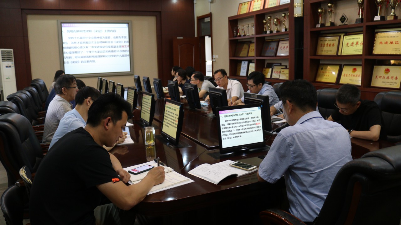 2020年7月2日,计算机学院党委理论学习中心组(扩大)于J13-220会议室集体学习党的十九届四中全会精神,学习由党委书记牟仁刚主持,院长梁永全结合个人学习体会作了专题辅导报告,中心组全体成员和党支部书记参加学习。