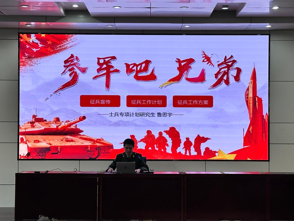 宣讲会上,学院“嵙计军鹰连”的硕士研究生鲁思宇围绕入伍政策、中国国防事业的发展前景、个人军旅生涯等内容,进行了深入讲解和分享。他从个人经历出发,讲述了军旅生涯中的成长历程和难忘瞬间,生动再现了军人生活的艰苦与荣光,并详细解读了参军入伍后在学费补偿代偿、考学优待及退役安置等方面的政策优势。同时,他还结合自身对国防事业的理解,向大家展示了中国国防建设的光辉前景,鼓励同学们勇担时代责任,踊跃参军报国。
