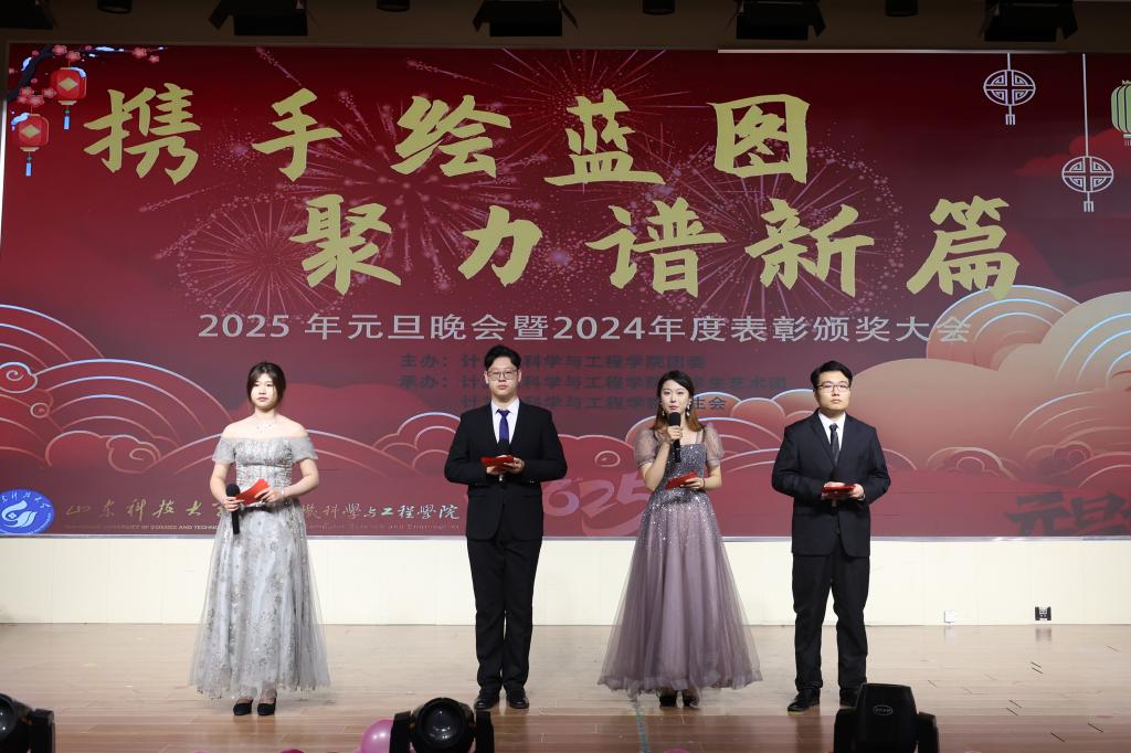 携手绘蓝图,聚力谱新篇,12月31日晚,计算机学院在大学生活动中心二楼报告厅举办2025年元旦晚会暨2024年度表彰颁奖大会。学院党委书记牟仁刚,院长梁永全,党委副书记、副院长郝亮,副院长赵建立、李豪杰,学工办主任(团委书记)王春宇,计算机系主任鲁法明,软件系党支部书记刘冰,物联网系党支部书记于建志,信安系主任廉文娟,智能系主任亓亮,各系教师和全体团委老师出席活动。
