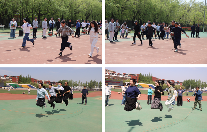 教工趣味赛上,教师们个个精神饱满,活力四射。在托球跑项目中,教师们手持羽毛球拍托着排球迅速奔跑,动作敏捷而协调。跳大绳项目教师们配合默契,随着绳子的起落灵活跳跃,这不仅是一场体力的较量,更是智慧与团队协作的展现。