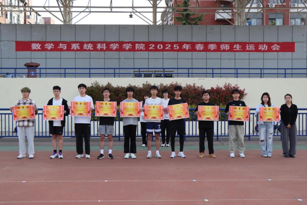 下午 17 时,运动会圆满落幕。闭幕式公布团体总分排名并宣布获奖名单,数据科学与大数据技术2024级2班、4班荣获“最佳方队表演奖”,统计学2023级1班摘得甲组团体冠军,统计学2024级1班摘得乙组团体冠军,学院团委书记谢菲菲为获奖班级颁奖并合影留念。