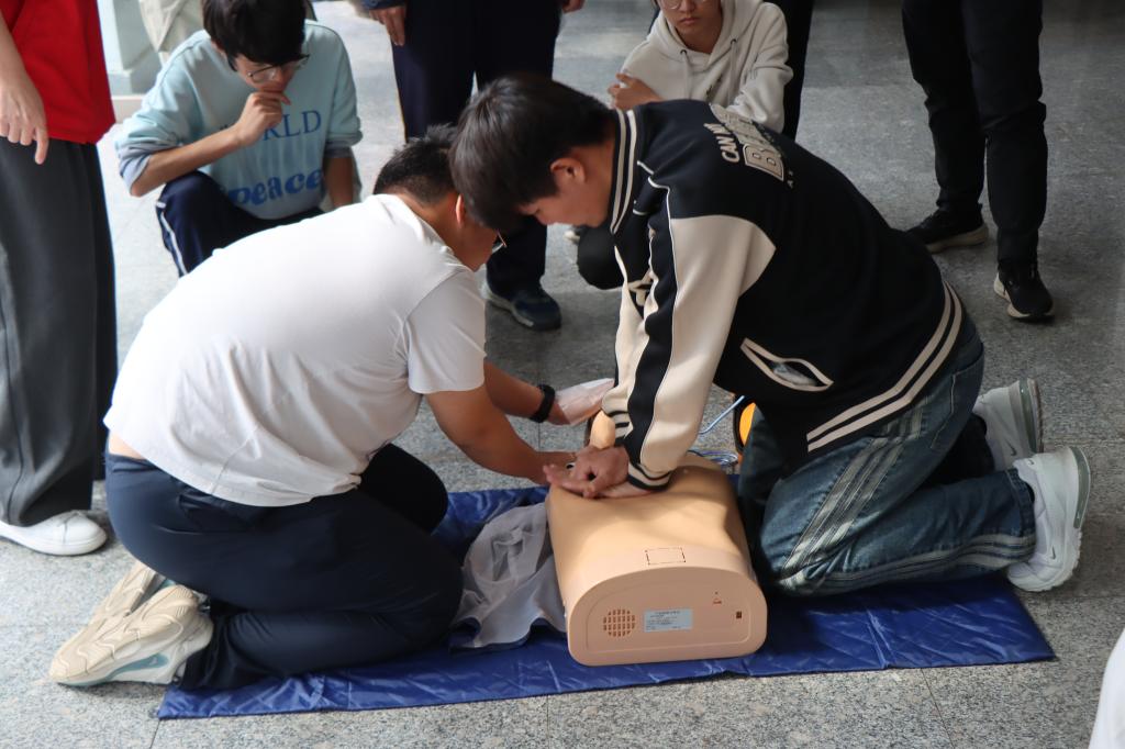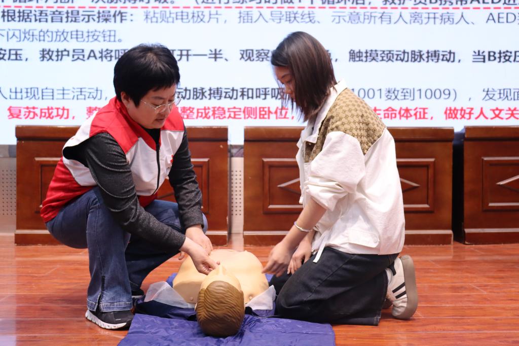 培训中,魏丽丽以2021年欧洲杯球员心脏骤停及2023年亚运会运动员突发晕厥等典型案例为切入点,结合“黄金四分钟”急救理论,讲解了科学施救对挽救生命的重要价值。系统传授了心肺复苏标准动作、AED规范操作及气道异物急救要点,帮助参训学生建立完整的急救知识体系。实践环节中,参训通过分组模拟急救场景开展技能实训,帮助学生精准掌握胸外按压的深度频率控制、AED规范操作等核心技能,切实提升急救实践能力。