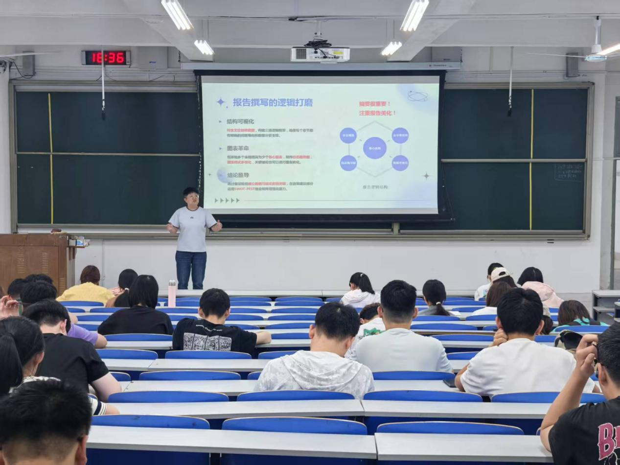 李慧琳以“从备赛到夺魁”为题从赛前准备、备赛历程、调研过程、报告撰写以及答辩展示等五个方面详细介绍了团队的整个参赛历程。她建议同学们在组队时可以跨年级、跨专业组队,充分发挥不同年级和专业同学的优势,提升团队的整体实力。