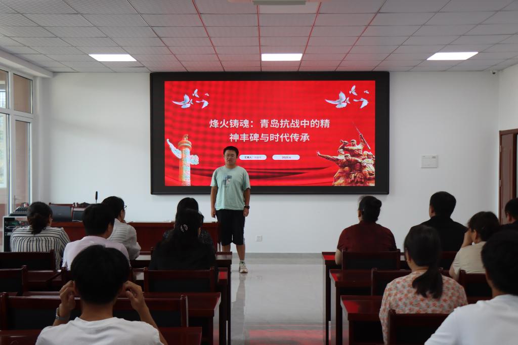 活动伊始,社区党员们整齐列队,高举右拳,重温入党誓词。随后,宣讲团代表刘溢东以《烽火铸魂:青岛抗战中的精神丰碑与时代传承》为题开展主题宣讲,他结合详实的历史档案、文献资料,以“视频+故事”的形式将青岛抗战时期的英雄事迹与感人瞬间一一呈现在大家面前。从人物事迹的娓娓道来,到精神内核的深刻剖析,刘溢东的宣讲深入浅出,引人入胜,让大家深刻领悟到了抗战精神的丰富内涵与时代价值。