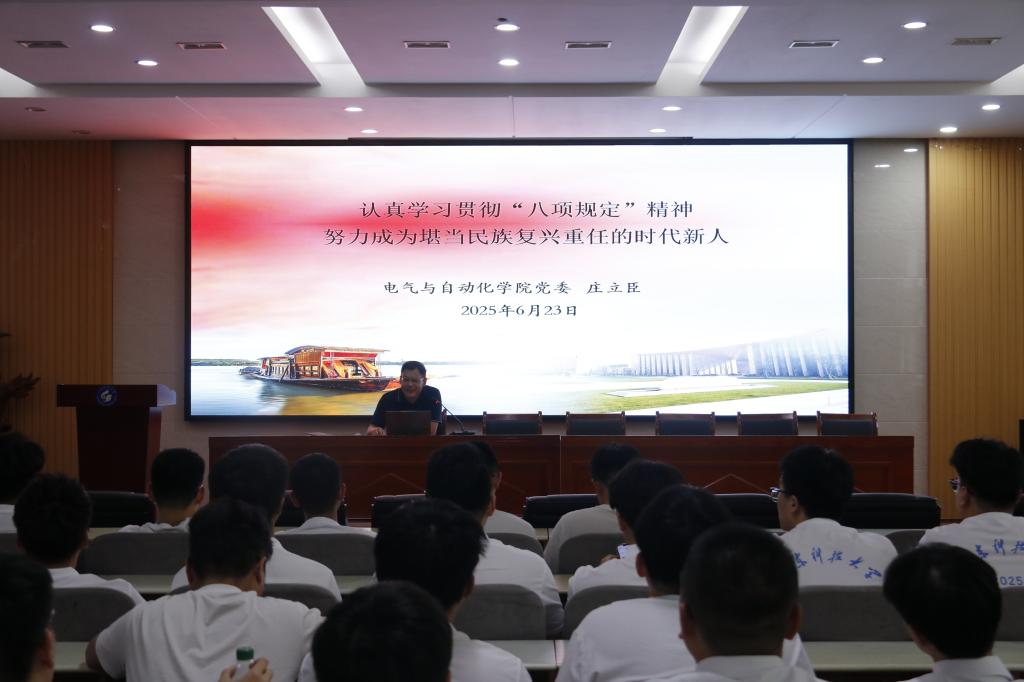 在全党上下开展深入贯彻中央八项规定精神学习教育之际,6月23日下午,自动化学院党委书记庄立臣面向2025届毕业生党员讲授离校前“最后一堂党课”。学院180名毕业生党员参加。