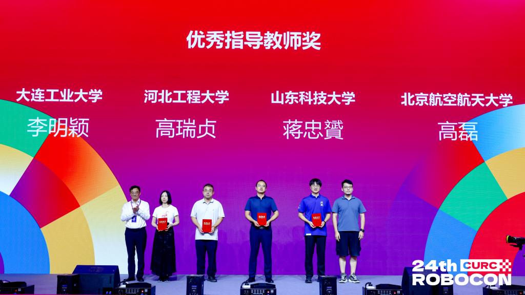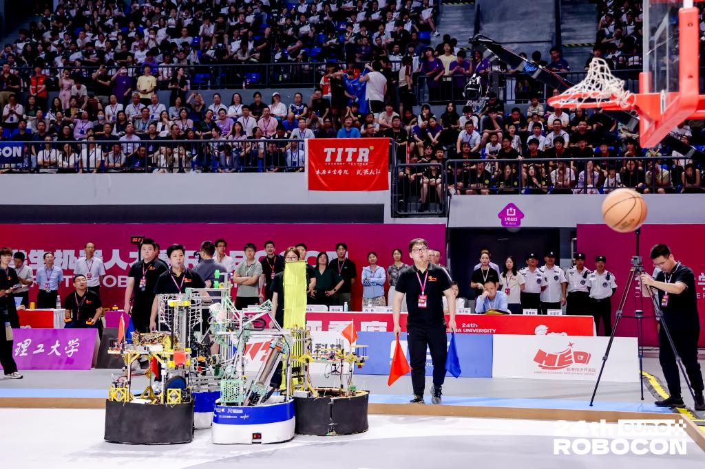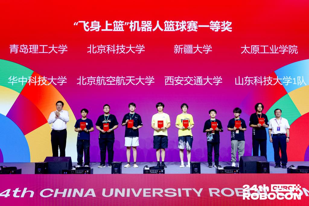 在“飞身上篮”小组赛中,战队三战三捷,以小组第一的成绩晋级十六强;淘汰赛中,面对强劲对手,战队毫不示弱,凭借过硬的技术、清晰的战术、队员精准的操作与默契的配合,战胜河北工程大学、绝杀西安交通大学挺进四强,最终获得全国季军。同时,战队在仿生足式、机器人排球分赛项中也创造战队历史最佳战绩。