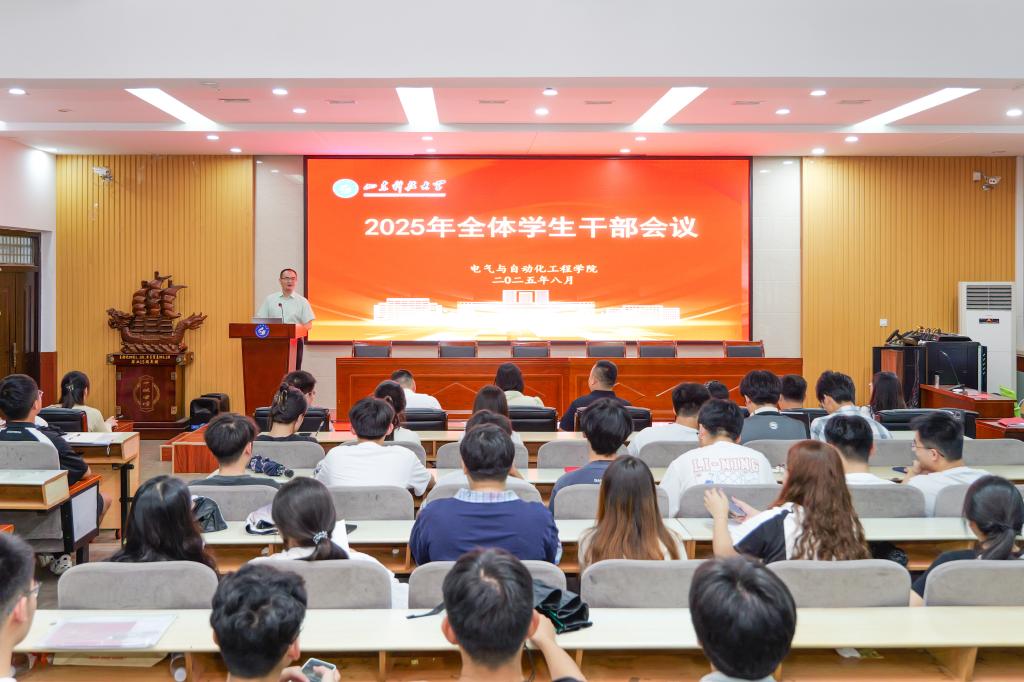 为明确新学期学生工作方向,凝聚学生干部力量,8月31日下午,自动化学院于J11报告厅召开新学期学生干部大会。学院党委副书记兼副院长赵洋、学工办主任(团委书记)杨洪骞、全体辅导员及学生干部参会。会议由杨洪骞主持。