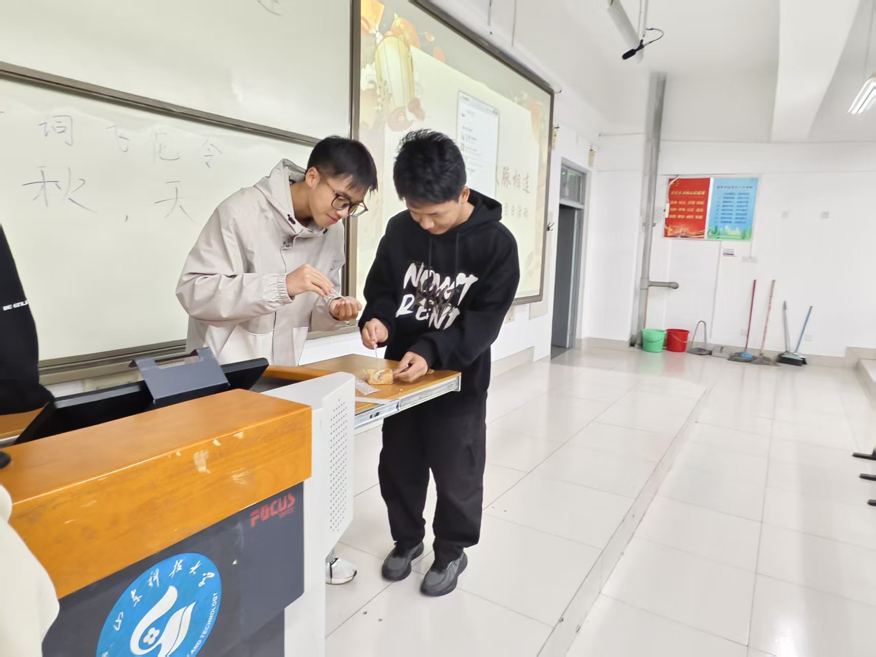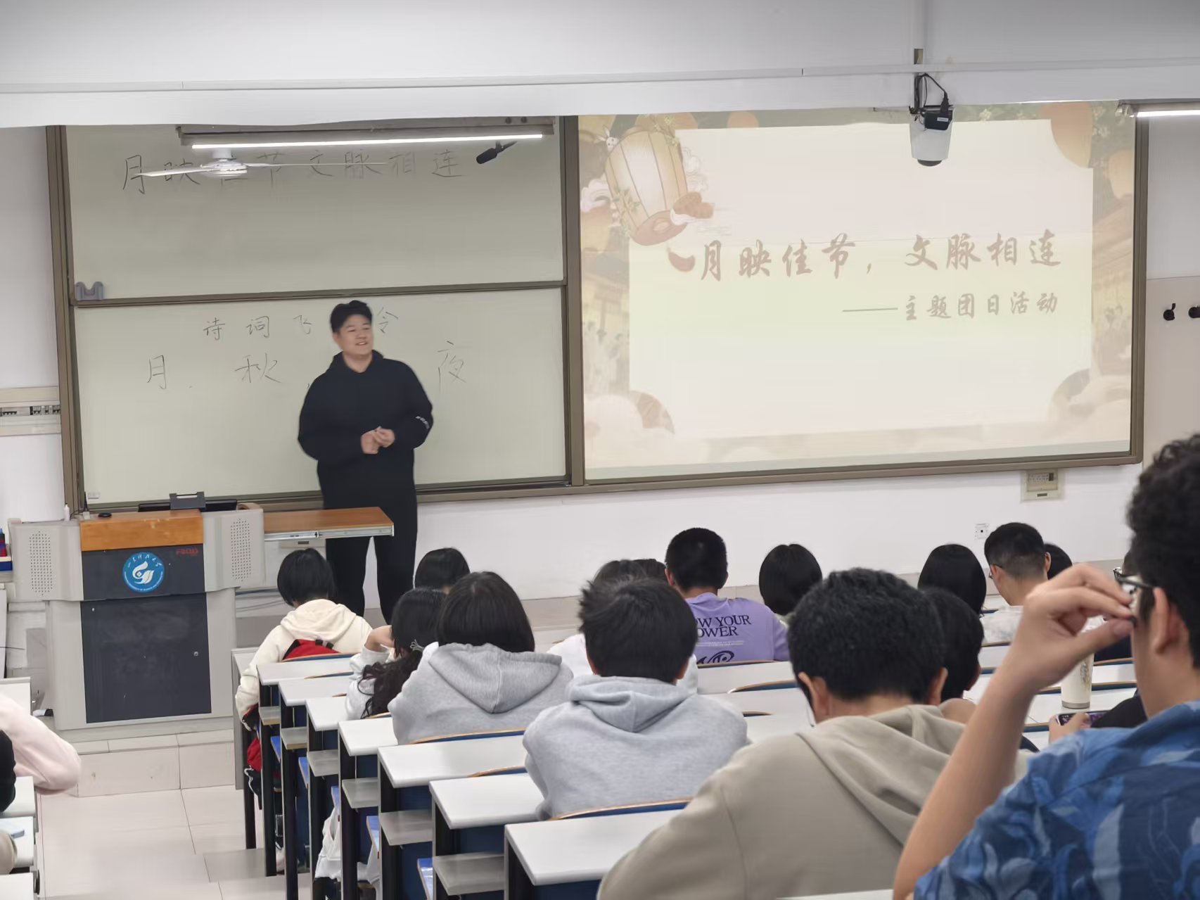 活动前期,青马工程基础班团支部召开例会明确分工,筹备影片、诗词卡片、月饼等物资。首个环节为中秋主题影片欣赏,影片以细腻的镜头语言展现中秋“赏月、祭月、阖家团圆”的传统习俗,从古代文人墨客的中秋雅集到现代家庭的团圆场景,让在场团员直观感受中秋文化的历史传承与时代演变。随后的“中秋诗词飞花令”环节,主持人以“月”“秋”“圆”等中秋相关关键字为令,邀请团员轮流背诵含有关键字的诗词,从“但愿人长久,千里共婵娟”到“举头望明月,低头思故乡”,团员们积极举手、踊跃应答,不仅重温了经典诗词,更在互动中加深了对中秋文化内涵的理解。