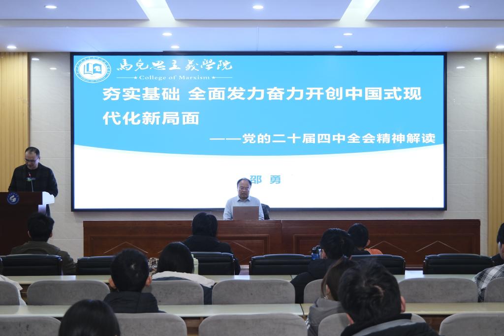 随后,邵勇教授应邀为全体学员讲授开班第一课。他以《党的二十届四中全会精神解读》为题作专题辅导报告,系统阐述了全会召开的重大意义、核心要义与实践要求,深入解读了坚持和完善中国特色社会主义制度、推进国家治理体系和治理能力现代化的系列部署。报告紧扣时政、内涵丰富,通过理论与实例相结合的方式,引导学员深刻把握国家发展大势与时代青年责任。