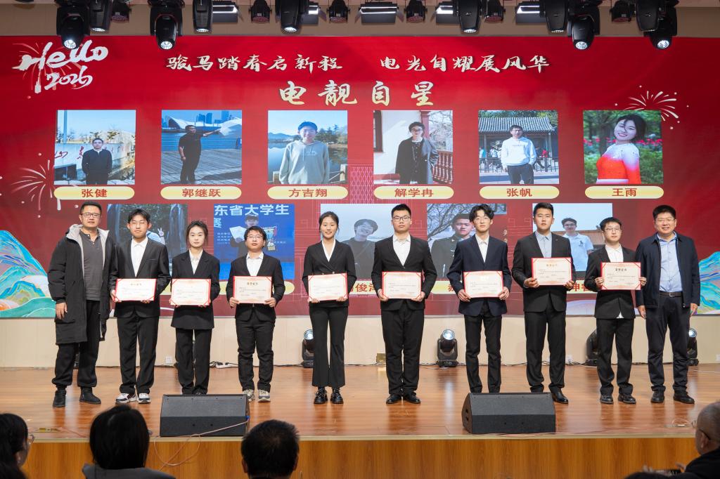 晚会中场,进行了2025年度“电靓自星”颁奖典礼,与会领导向学习之星(张健、郭继跃、方吉翔)、科创之星(解学冉、张帆)、实践之星(王雨、费继冲)、文艺之星(郝恩睿、李坤睿)、体育之星(尹智博、冯俊泽)颁发荣誉证书,激励全院学子见贤思齐、奋发有为。