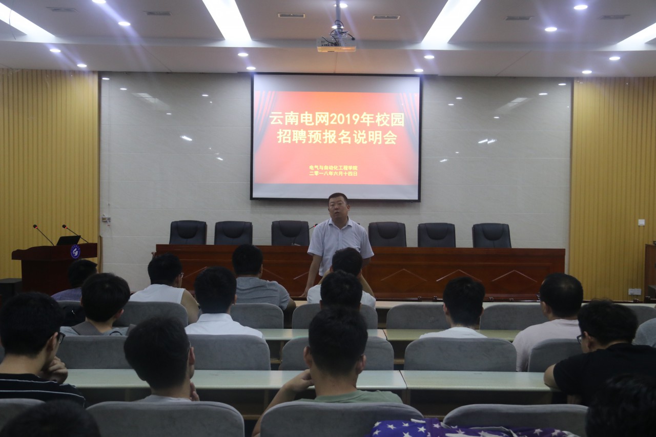 为提升我院2019届毕业生的就业意识,及时给予2019届毕业生就业指导与帮助,2018年6月14日在自动化学院118泰山报告厅召开2019届毕业生云南电网预报名动员会。党委副书记赵健、2019届毕业生辅导员郭婷参加此次会议。
