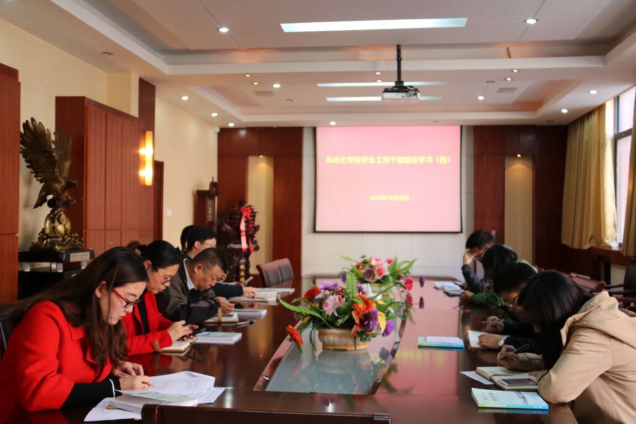 2018年10月30日下午,自动化学院在学院会议室进行学生工作干部理论学习。学院党委副书记赵健,团委书记许琳,团委老师张国松、杨洪骞、郭婷、于凯、韩梅,以及三位兼职辅导员宋石、李雪稳、肖宜辉参加了本次学习。本次学习的主要内容有深入领悟新时代全国高等学校本科教育工作会议精神,认真学习《高等学校辅导员职业能力标准(暂行)》,推进学院学生宿舍精细化管理。