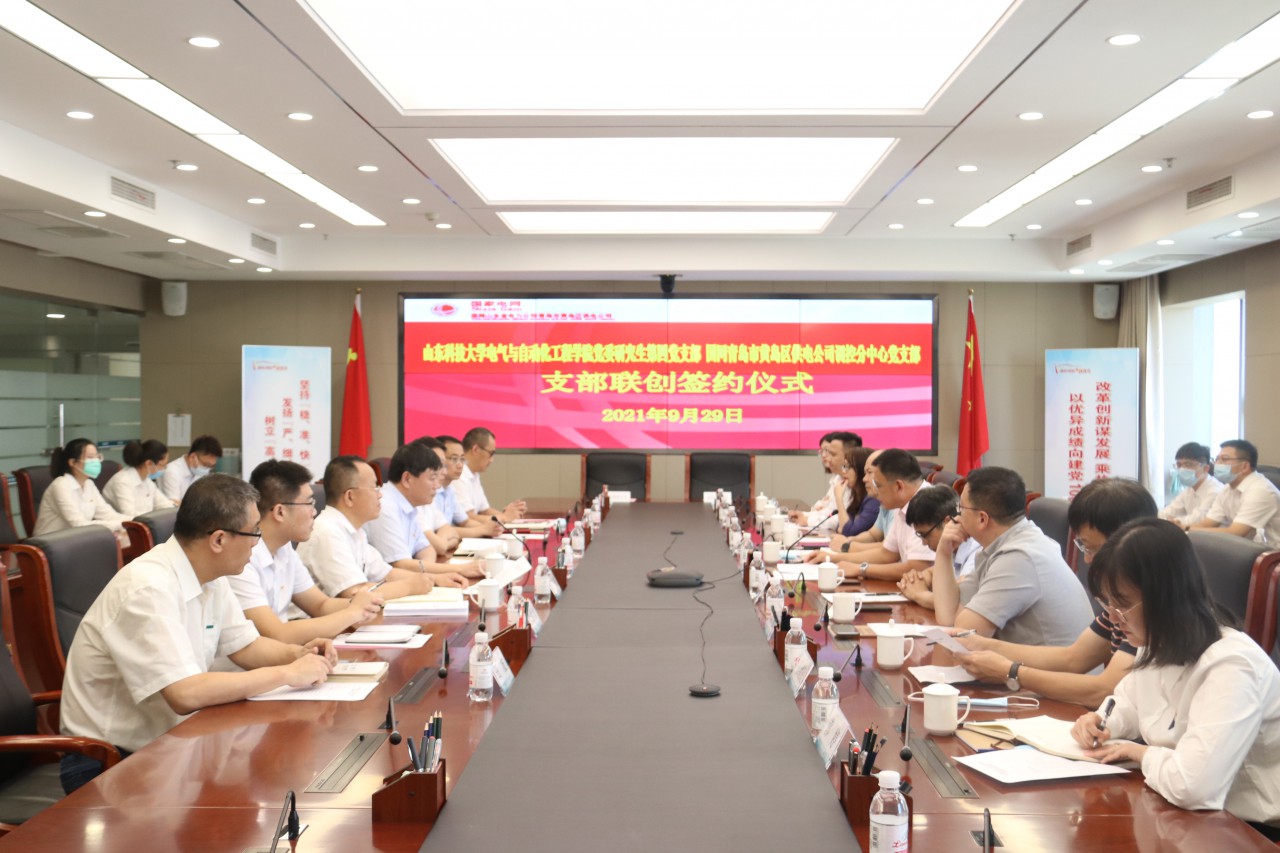 为深入学习贯彻习近平新时代中国特色社会主义思想,扎实推进党史学习教育,贯彻落实新时代党的建设总要求。经山东科技大学电气与自动化工程学院党委研究生第四党支部与国网青岛市黄岛区供电公司电力调度控制分中心党支部友好协商,决定建立长期、稳定的结对共建关系,开展多渠道、多层次、多形式的合作共建。9月29日上午,双方“结对共建”签约仪式在国网青岛市黄岛区供电公司举行。电气与自动化工程学院党委书记庄立臣,党委研究生工作部副部长刘松,国网青岛市黄岛区供电公司党委书记宋成清出席签约仪式,双方相关工作人员参加了签约仪式。