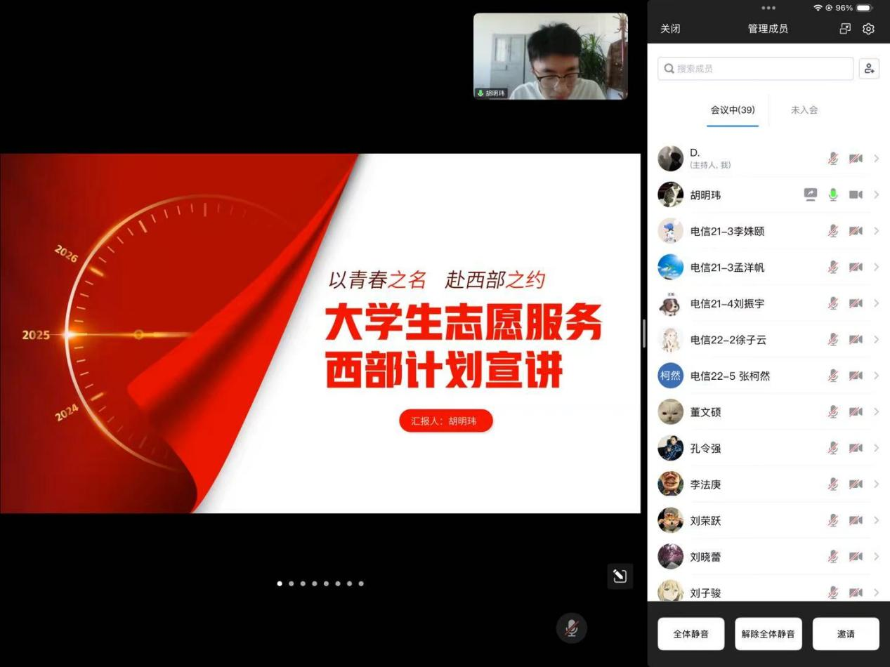 为积极响应共青团中央关于引导青年面向基层就业的号召,深入落实大学生志愿服务西部计划相关工作部署,引导青年学子厚植家国情怀、勇担时代使命,4月12日以线上形式成功举办2025年大学生志愿服务西部计划专题宣讲会。活动特邀2020级优秀校友、西部计划优秀志愿者胡明玮担任主讲,吸引了近50多名应届毕业生及在校学生云端相聚,共同凝听西部故事。