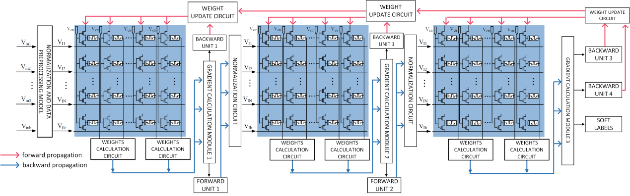 基于忆阻器交叉阵列实现了一种知识蒸馏在线训练电路架构,旨在提高边缘设备上深度学习的推理效率并降低能耗,如图3所示。该电路架构能够利用忆阻交叉阵列高效更新权重和计算,进行实时数据处理。该架构克服了在复杂深度神经网络中传统故障检测方法的低效问题,短时间内同时检测区域内所有忆阻器件,极大提高故障检测效率。通过结合区域检测方案,电路在故障条件下的模型训练和推理能力得到显著提高,展示了其在边缘计算电路故障检测中的潜力和优势。