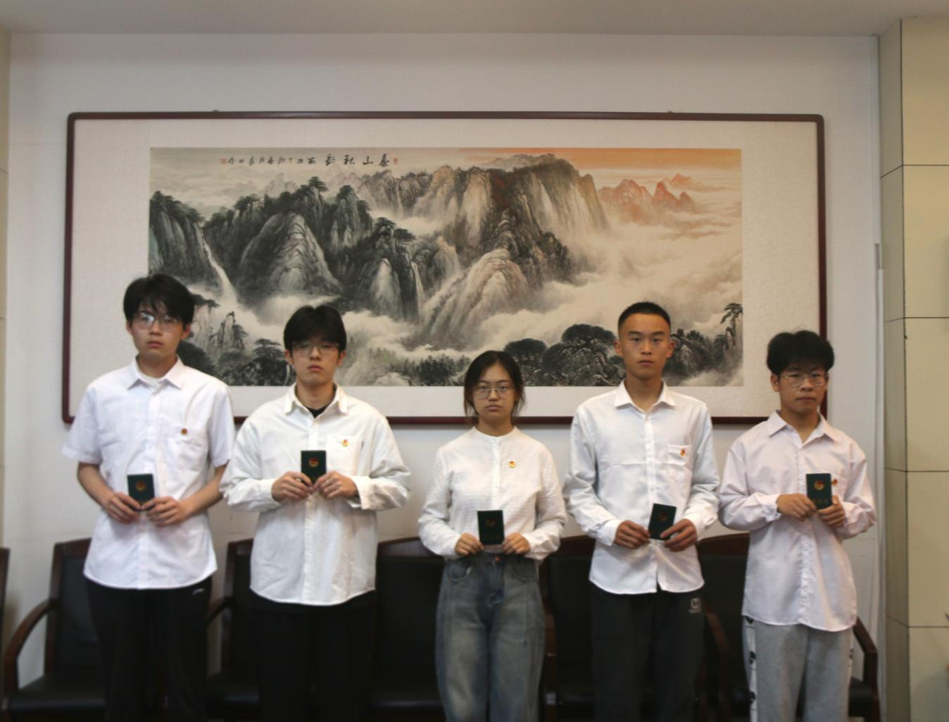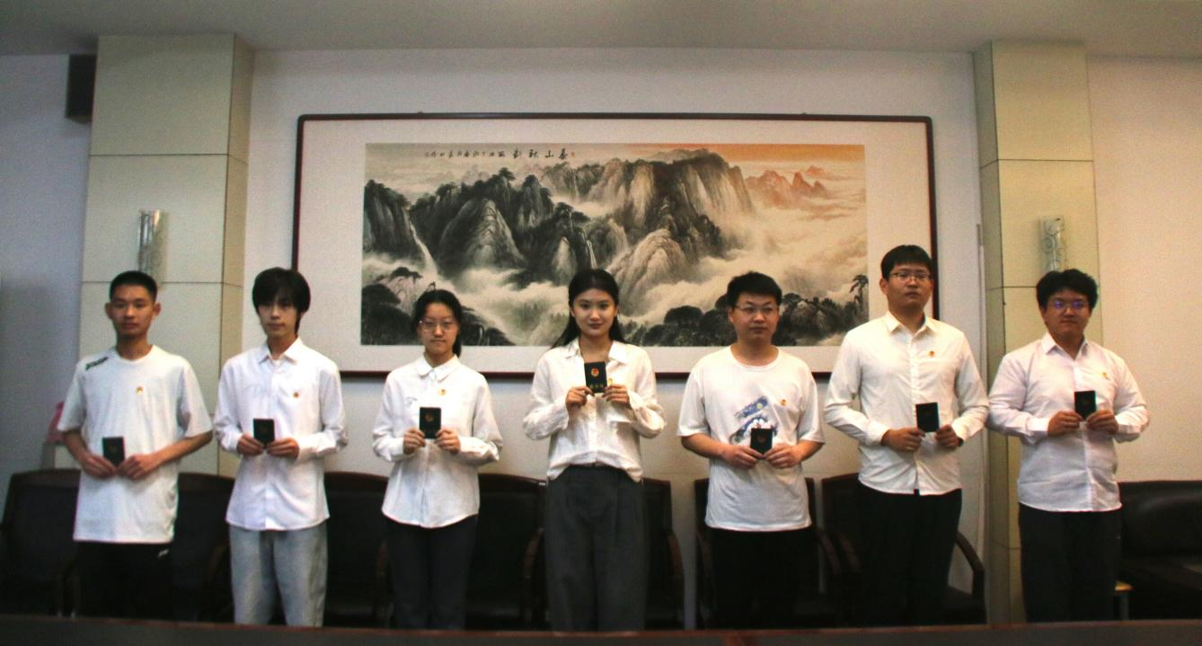 仪式在庄严的国歌声中正式开始。全体与会人员肃立齐唱国歌,激昂的旋律彰显着青年学子对祖国的深厚情感。随后,阎祥东宣读《中国共产主义青年团章程》中“团员的义务与权利”章节,并宣布新发展团员名单。在热烈的掌声中,张科、王晓军、刘雅斐为新团员颁发团员证并佩戴团员徽章。熠熠生辉的团徽佩戴于左胸,象征着共青团员的责任与信仰。新团员们目光坚定,以挺拔的姿态接受这份光荣的象征。新团员代表翟浩宇带领全体新团员面向团旗庄严宣誓,展现了新时代青年坚定不移跟党走的决心。