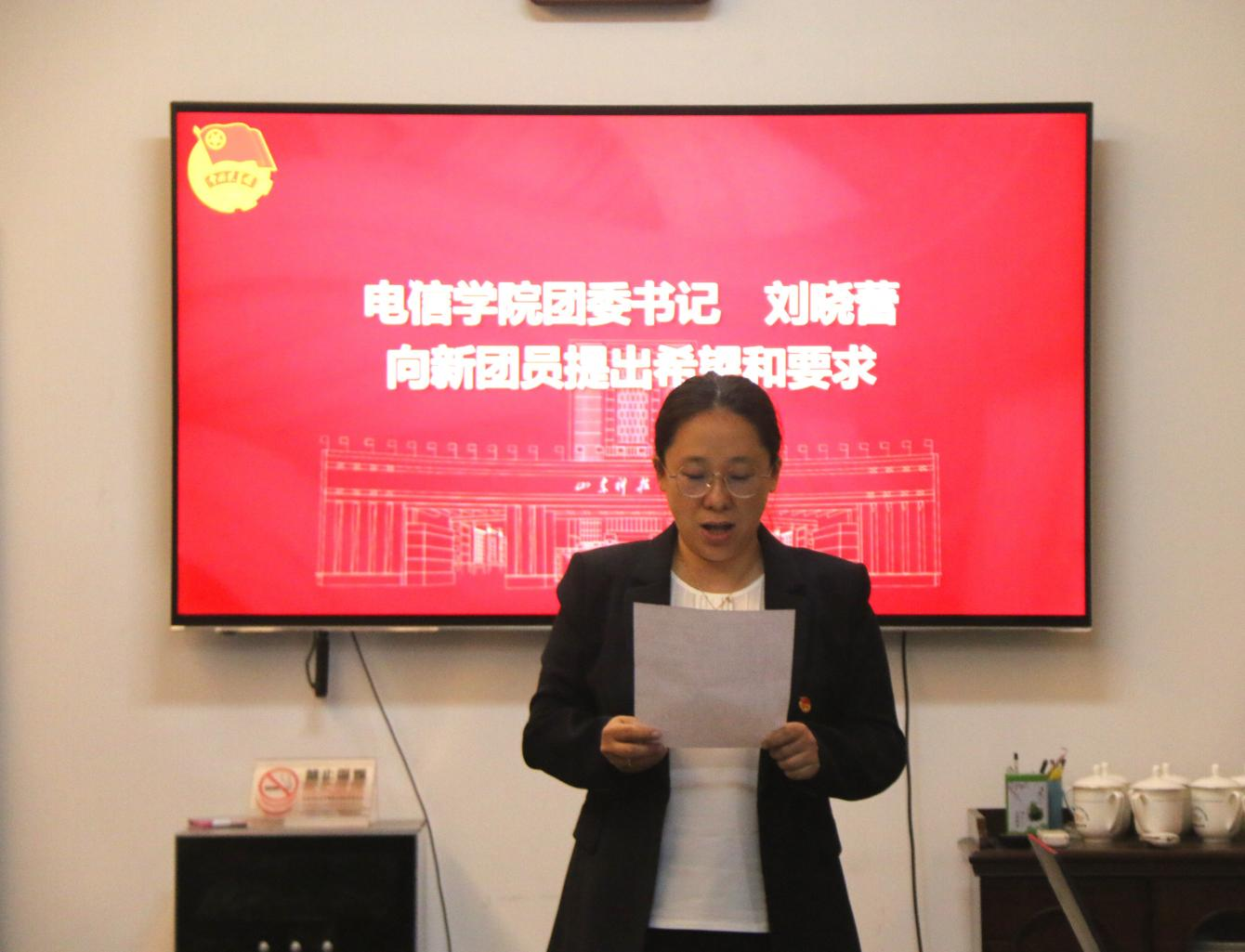 4月27日下午,电信学院在J11-305会议室举行新发展团员入团仪式。学院团委书记刘晓蕾,辅导员阎祥东、张科、王晓军、刘雅斐出席仪式,20名新发展团员及团员代表共同参与此次活动。