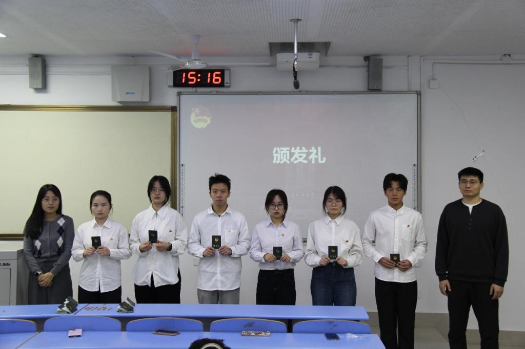 辅导员张科、王晓军、阎祥东、刘雅斐、吕琳依次为新发展团员佩戴团徽、颁发团员证。熠熠生辉的团徽佩戴在胸前,象征着共青团的荣耀与责任。