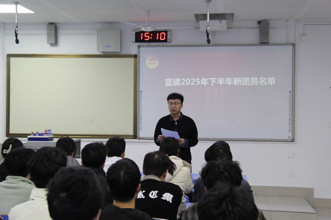 仪式在庄严的中华人民共和国国歌声中正式拉开帷幕。辅导员王晓军宣布新团员名单,带领新发展团员共同学习《中国共产主义青年团章程》中关于“团员的义务与权利”的重要章节,助力新发展团员深刻认识自身肩负的责任与使命。