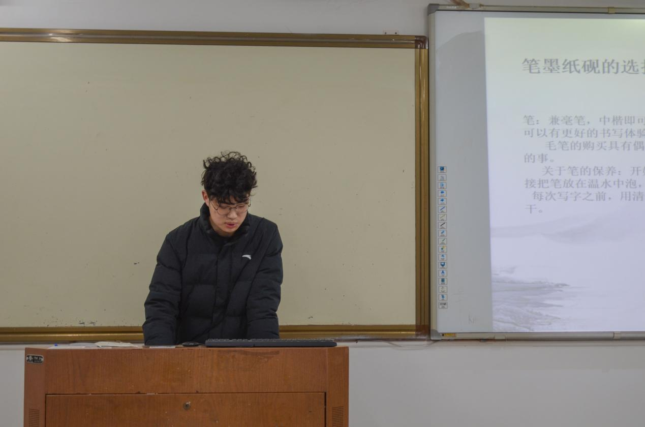 本次活动以楷书入门为核心,从书法工具的选择与使用(如兼毫笔、半生熟宣纸的适配技巧)、欧阳询《九成宫醴泉铭》碑帖的临摹方法,到五指执笔法的实操要点、横画等基础笔画的书写逻辑,逐一拆解入门难点。王立童在讲解中还融入学习心态引导,鼓励同学们以享受过程的轻松状态接触书法。活动尾声,协会成员鼓励在场同学主动参与书法实践,部分同学在王立童的指导下拿起笔墨,完成了楷书笔画与简单字的书写尝试,将理论知识转化为实践体验。