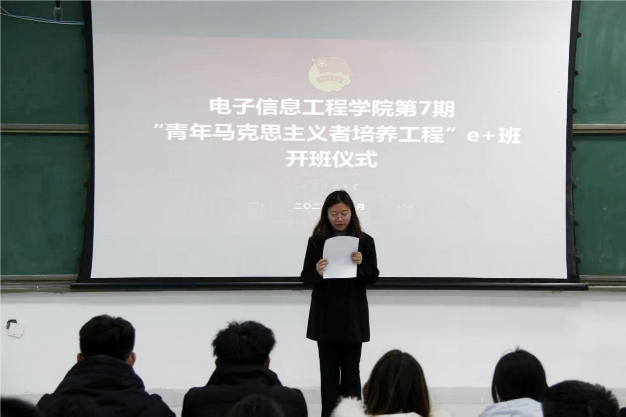 为持续深入学习贯彻习近平新时代中国特色社会主义思想,扎实推进青年马克思主义者培养工程,12月2日下午,电信学院在J7-103教室举行第七期“青年马克思主义者培养工程”e+班开班仪式。学院团委书记兼学工办主任刘晓蕾、辅导员阎祥东、王晓军、刘雅斐、吕琳出席,45名学员共同参与。