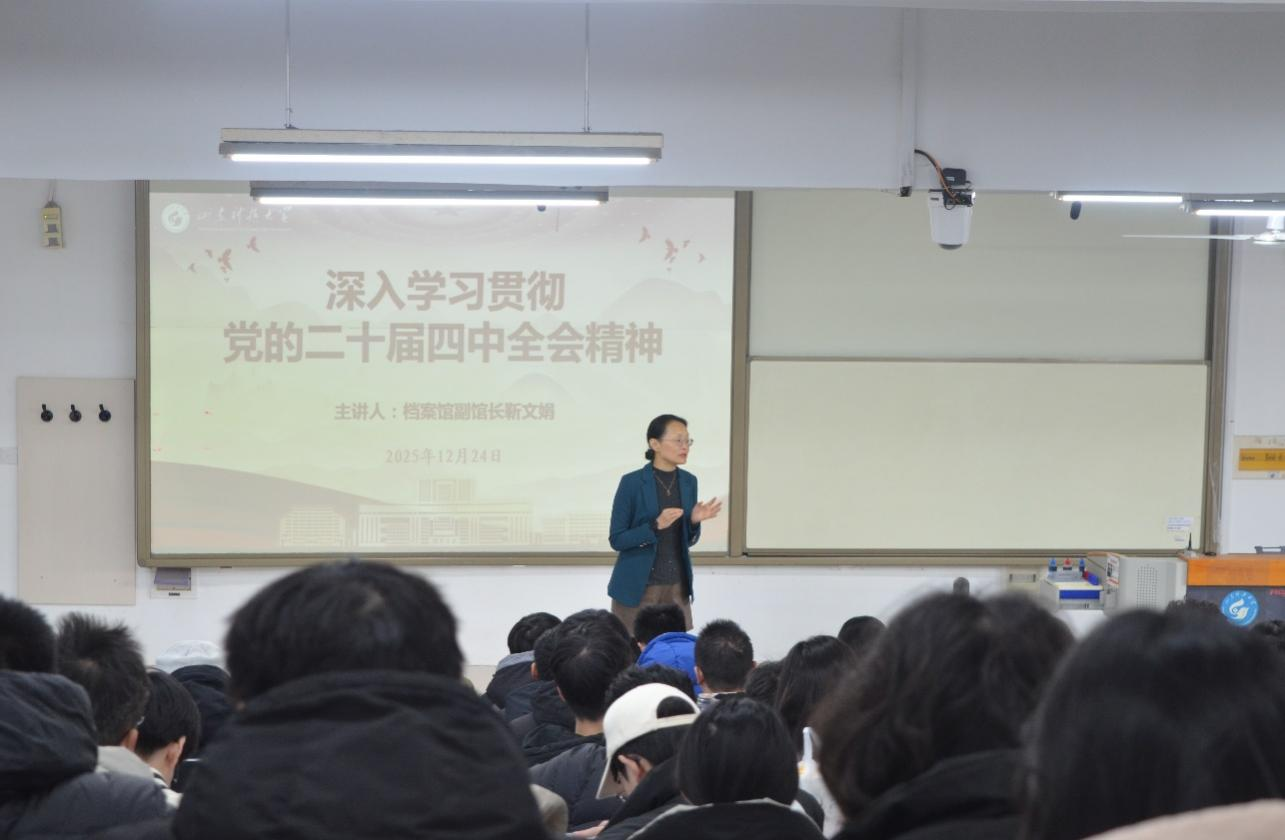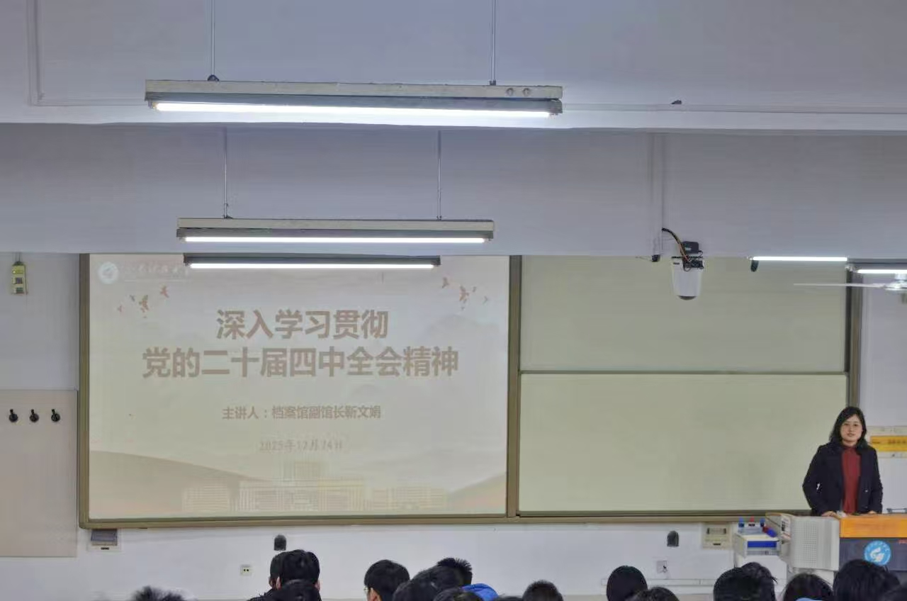 为筑牢思想根基,切实把思想和行动统一到党中央决策部署上来,12月24日下午,档案馆副馆长靳文娟、审计处副处长刘华伟、电信学院副书记兼副院长陈冰为联系班级宣讲党的二十届四中全会精神,西海岸档案馆乔雪莲、冯培霖结合档案管理进行专题宣讲。