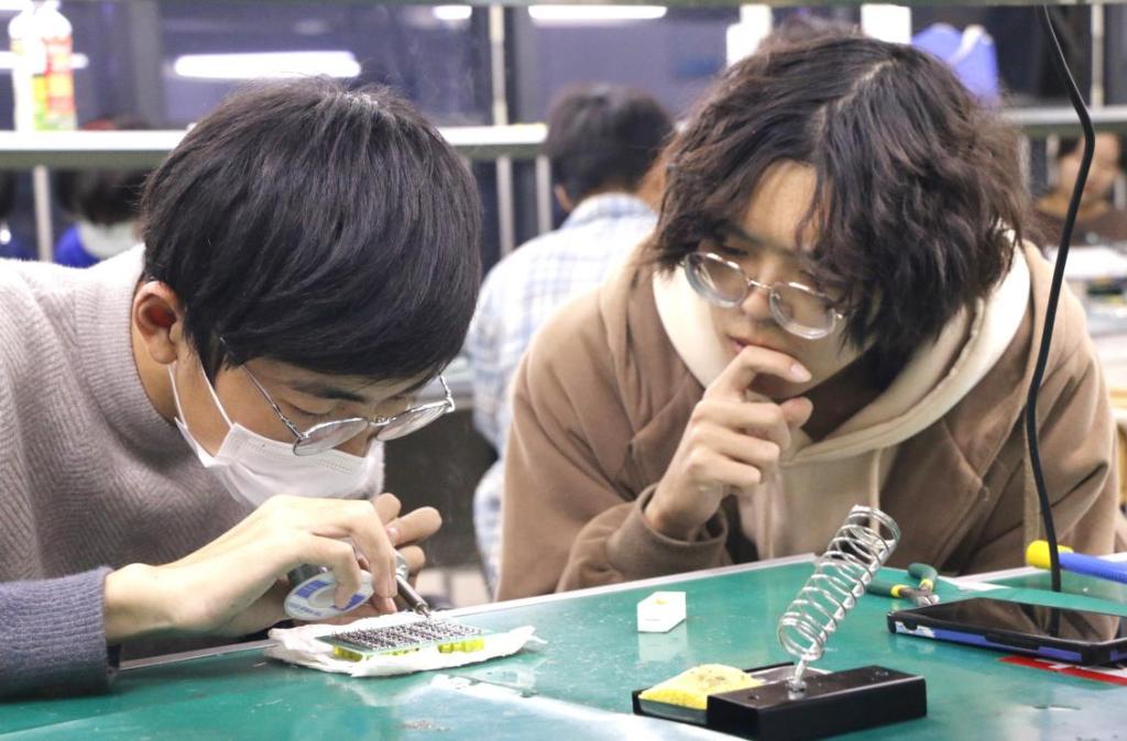 赛事期间,各参赛队伍充分展现了团队协作的力量,勇于探索,敢于创新。在紧张激烈的比赛氛围中,参赛选手们凭借深厚的专业知识基础,灵活运用其高超的手工技艺,不仅创造出了富有创意且美观的图案设计,还精准无误地完成了每一个焊点的焊接工作,展现了卓越的技术水平。所有参赛队伍均秉持着创新、严谨、求实、实用的核心理念,将安全规范视为首要原则,面对比赛中层出不穷的挑战,他们毫无畏惧,积极应对,展现了出色的应变能力和解决问题的能力。在此期间,科技创新部的工作人员全程陪伴,为选手们提供了及时有效的支持与帮助。