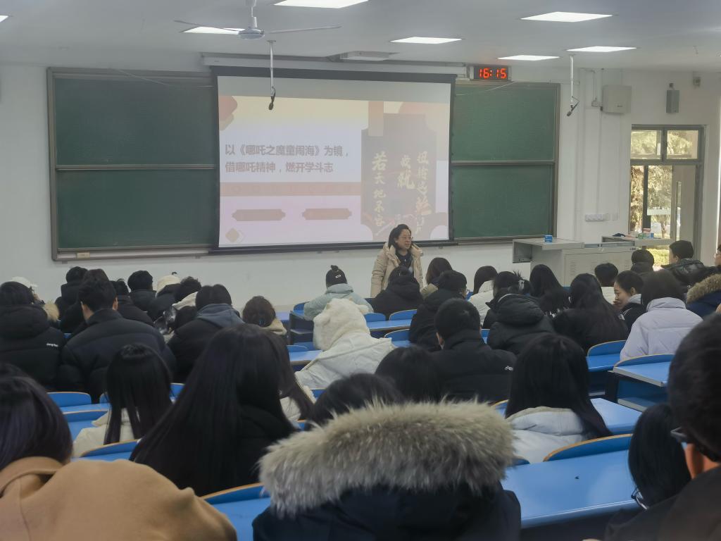 在《坚守信念:勇敢面对挑战》专题,辅导员刘晓蕾、王晓军以哪吒面对命运不公却始终坚守“我命由我不由天”的信念为例,希望同学们遇到困难与挫折,要像哪吒一样保持积极的心态,收获成长与进步。辅导员刘雅斐以《打破标签:激发自身潜能》专题,启示同学们在考研备考过程中,不应被过往成绩、他人评价所左右,要撕掉身上的“标签”,挖掘自身未知的潜力,勇攀考研高峰。《科技与文化齐飞:青年成长的“双翼”》专题中,辅导员李权强调电信领域的知识日新月异,传统文化作为民族的精神根脉,两者不可或缺。要将科技知识与文化底蕴有机融合,以文化为魂,以科技为翼,成为推动社会进步的复合型人才。谈及《凝聚力:从“孤胆英雄”到“团队共生”》,辅导员张科阐述了团队合作的重要性。希望同学们发挥各自所长,相互支持、相互配合,创造出 1+1>2 的效果。《目标意识:在“天劫”中寻找方向》专题,辅导员阎祥东把考研复试和找工作中的困难比作哪吒所面临的天劫,强调目标意识的关键作用。