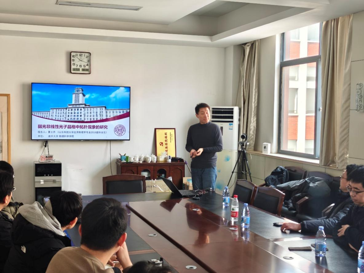 会后,夏士齐为电信学院师生作了题为《弱光非线性光子晶格中拓扑现象的研究》的学术报告。夏教授介绍了他发表在国际顶尖学术期刊关于拓扑光子学领域取得的系列研究成果,如光子石墨烯中的拓扑奇点映射、拓扑边界态观测,以及一维拓扑结构的非线性非厄密特性等。报告深入浅出,不仅开拓了在座师生的眼界,更引发了大家对前沿领域相关问题的兴趣与思考。会上,大家对自己感兴趣的问题与夏教授进行了深入的交流。
