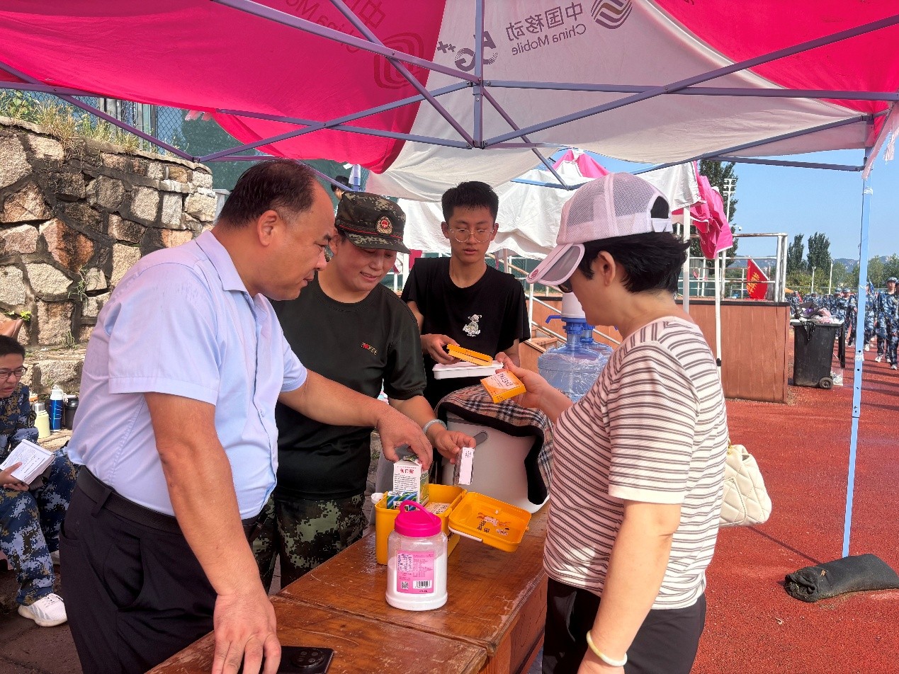 田书记细致检查了饮水供应、防暑药品等物资储备情况,仔细清点了冷藏箱内清凉用品的种类与数量,积极协调供水厂家,确保大桶水及时充足供应。她与带训教官、辅导员深入交流,详细了解训练进展和学生身体状况,对大家的辛勤付出表示感谢,强调要持续密切关注学生身心状态,全力做好各项服务保障,为同学们提供坚实可靠的后勤支持。