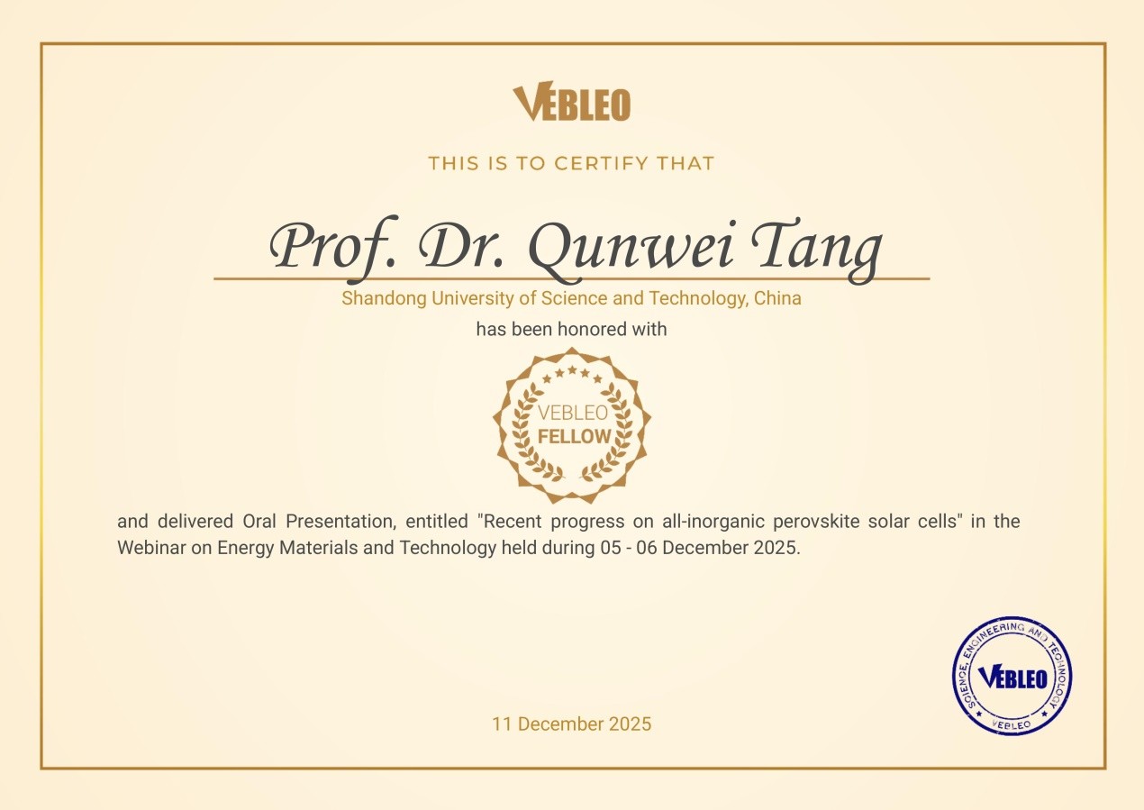 2025年12月11日,我院唐群委教授被授予国际科学组织Vebleo协会会士(Vebleo Fellow),并于12月5日受邀在Vebleo协会主办的能源材料与技术国际会议上作了题为“Recent progress on all - inorganic perovskite solar cells”的特邀报告。