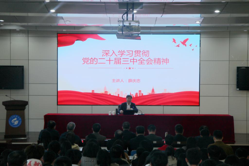 薛庆忠以党的二十届三中全会的重大意义为切入点,介绍了全会主题及主要内容,引领师生学习了全会提出的进一步全面深化改革的总目标和“六个坚持”重大原则,用“七个聚焦”集中阐述了总目标的要求,详细解读了《中共中央关于进一步全面深化改革推进中国式现代化的决定》中关于经济、政治、文化、社会、生态文明、党的建设等重大举措。他指出,要迅速把思想和行动统一到全会精神上来,把智慧和力量凝聚到全会确定的目标任务上来,全力推动全会精神入脑入心,切实用全会精神统一思想、指导实践,抓好核心要素,用好硬招实招,全力推动学校各项事业高质量发展。