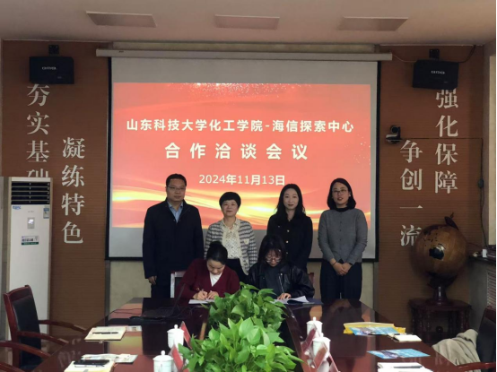 11月13日,海信探索中心总经理林其芬、副总经理赵明敏一行来我院交流洽谈。化工学院党委副书记兼副院长田静、副院长梁鹏接待了林其芬一行并进行会谈。