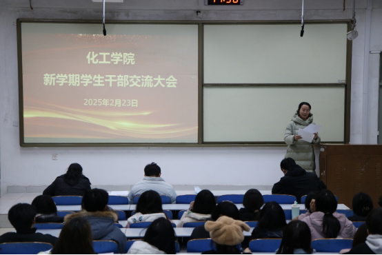 春风为序启征程,奋辑前行谱新章。2月23日,化工学院召开新学期学生干部交流大会暨开学第一课。学院党委副书记兼副院长田静主持会议并讲话,学院全体辅导员、全体学生干部参加了大会。