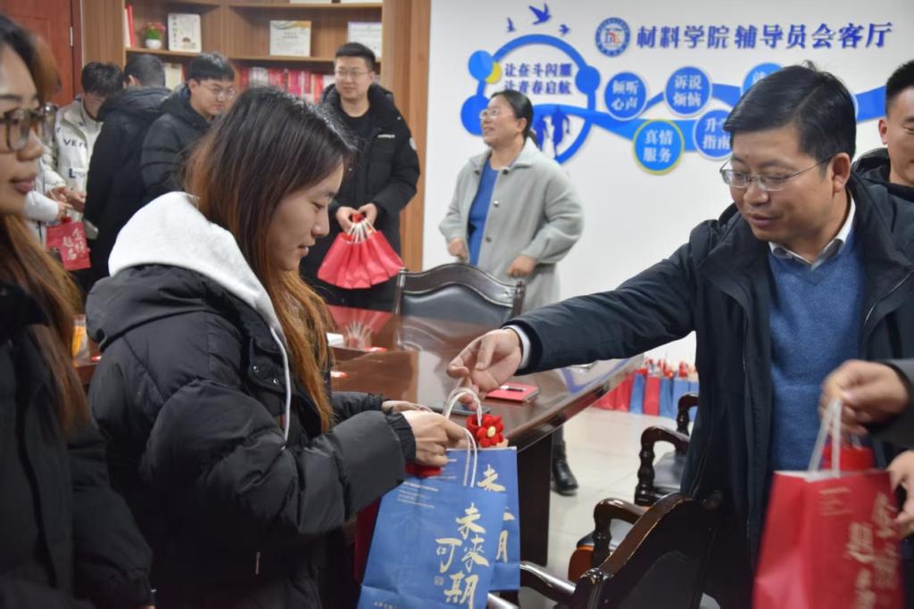 12月9日下午,材料学院在GC10图书银行举办考研送祝福活动,学院党委副书记兼副院长李建楠、团委书记马韶霞,各年级辅导员与部分考研学子共同参与。李建楠鼓励学子们坚定信念、全力以赴,以平和心态迎接考试;其他老师也送上真挚寄语,用温暖话语为学子们加油鼓劲,让备考路上的学子倍感关怀。另外,材料学院团委联合院学生会多部门于繁星广场举办“‘硕’果累累,‘香’约为定”祝福活动,吸引众多同学参与书签制作、香囊手工、暖心礼包包装等环节,“祝福小分队”随后将满载心意的礼物送入考研学子宿舍。