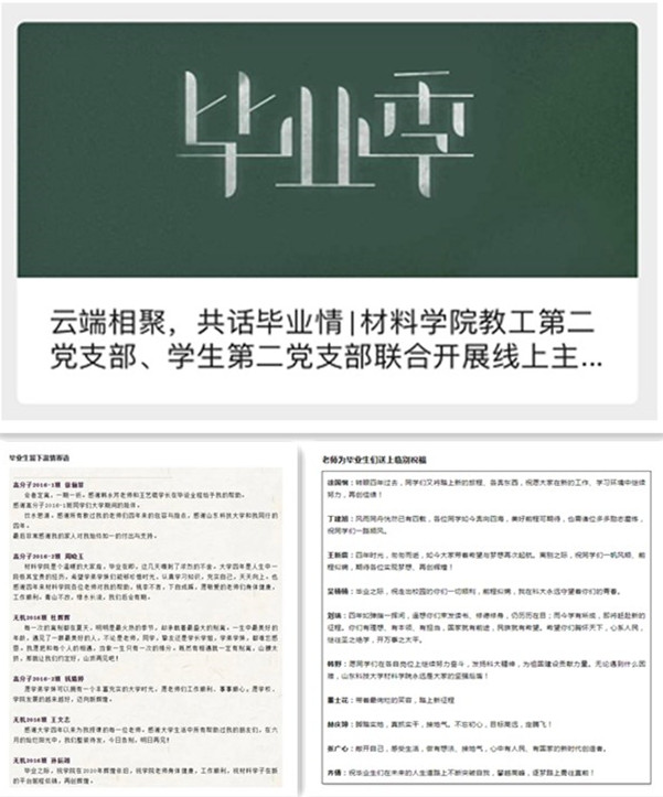 四年时光,匆匆而逝,在毕业生离校之际,材料学院教工第二党支部联合学生第二党支部开展了线上主题党日活动。师生们云端相聚,共话浓浓的毕业情。
