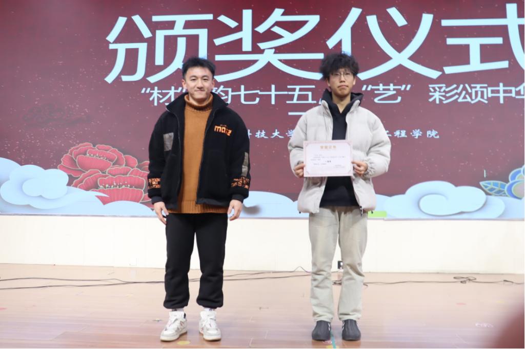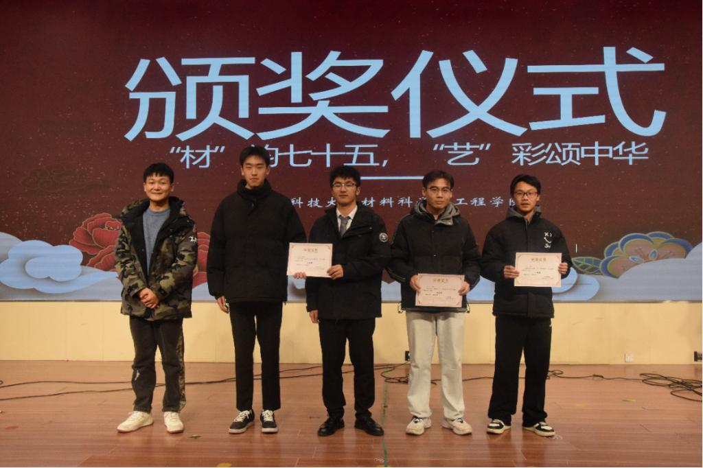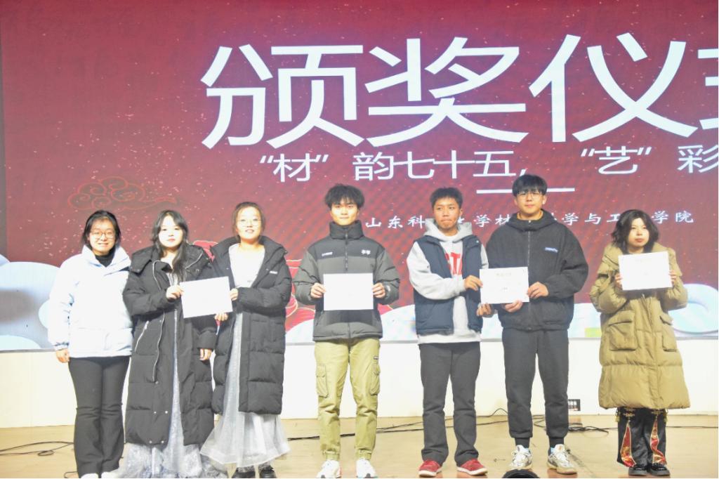 为发掘多元才艺,激发个人潜能、弘扬红色文化,12月15日晚,材料学院于大学生活动中心二楼报告厅举办“‘材’韵七十五,‘艺’彩颂中华”才艺大赛。优选计划辅导员王瀚琨、韩恒飞,学生代表周雨葶、孙源、樊骐恺、张文译、修艺航担任评委。