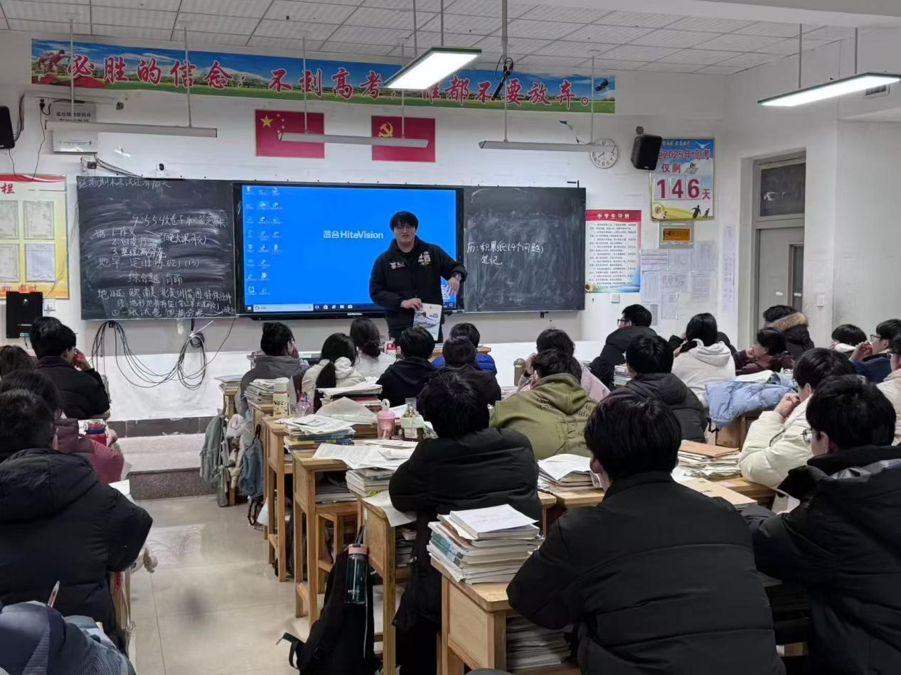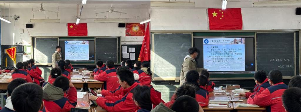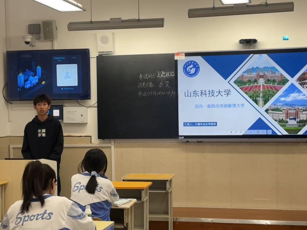 曲丽芹对高三生们进行了高考冲刺动员,并运用精心准备的PPT和宣传手册向学生们详细介绍了山东科技大学,最后设置答疑环节,耐心解答同学们关于高考备考、志愿填报、大学生活等方面的问题,为他们提供建议和指导。