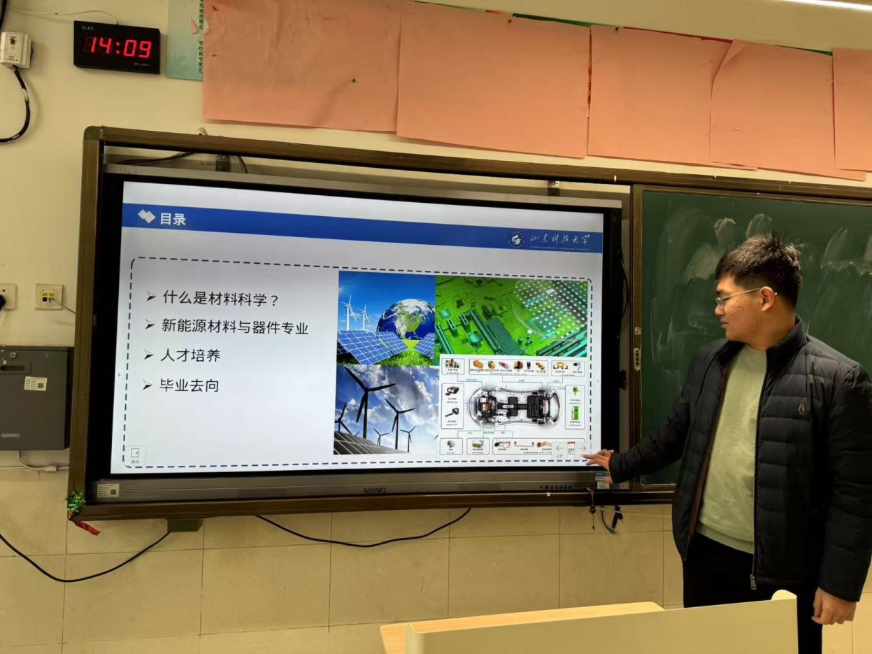 刘岱远进行宣讲的班级为理科班,所以他在为高三学子介绍山东科技大学时,详细介绍了材料学院以及新能源材料与器件专业,并为高三学子答疑解惑,分享心得。