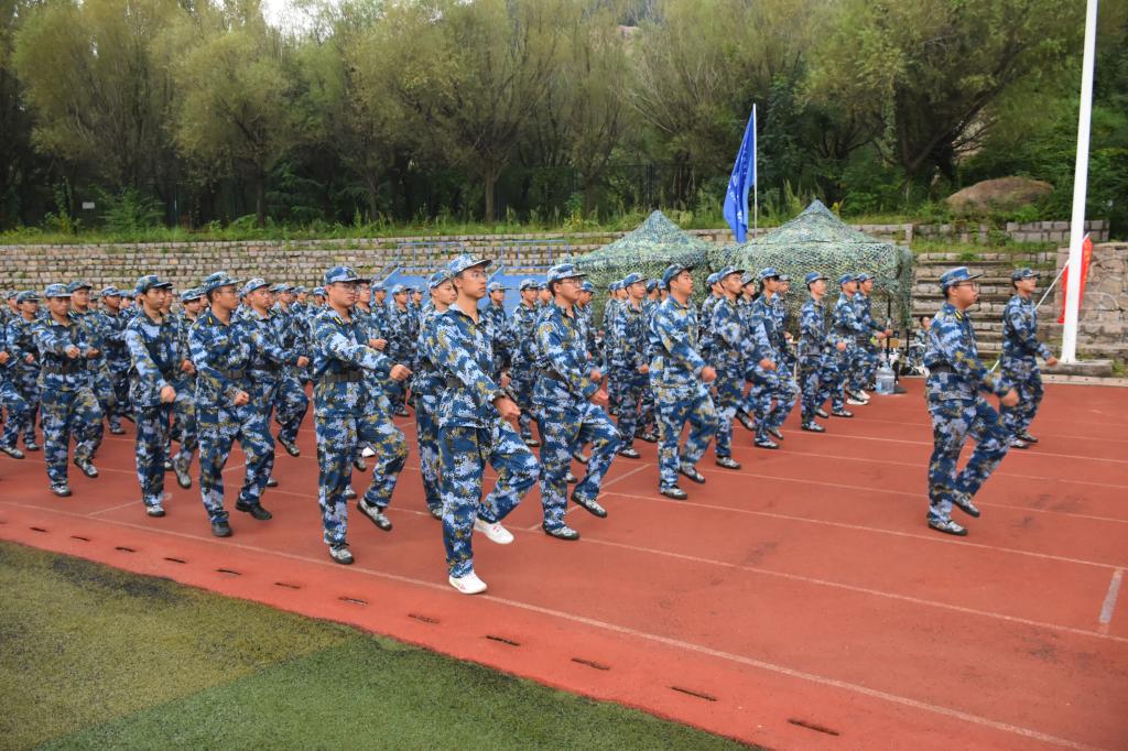 分列式训练是当天的重点。教官的口令声中,整齐的步伐声回荡在训练场上。教官们细致调整着队员的步幅、摆臂和踢腿高度,严格确保队列的整齐划一。即便休息时间,仍有同学主动加练,专注地打磨每一个动作细节。