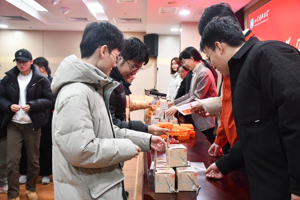 学院团委、学生会为考研学子精心准备了寓意深厚的“研途领航”暖心礼包,其中包含象征“一举夺魁”的葵花手办、寓意“一举高中”的香囊以及实用的文具套装。活动现场还设置了互动抽奖环节,老师们为同学颁发礼品,在温馨愉悦的氛围中缓解了同学们的备考压力。收到礼包的同学们纷纷表示,学院大家庭的关怀让他们倍感温暖,更加坚定了拼搏到底的决心。