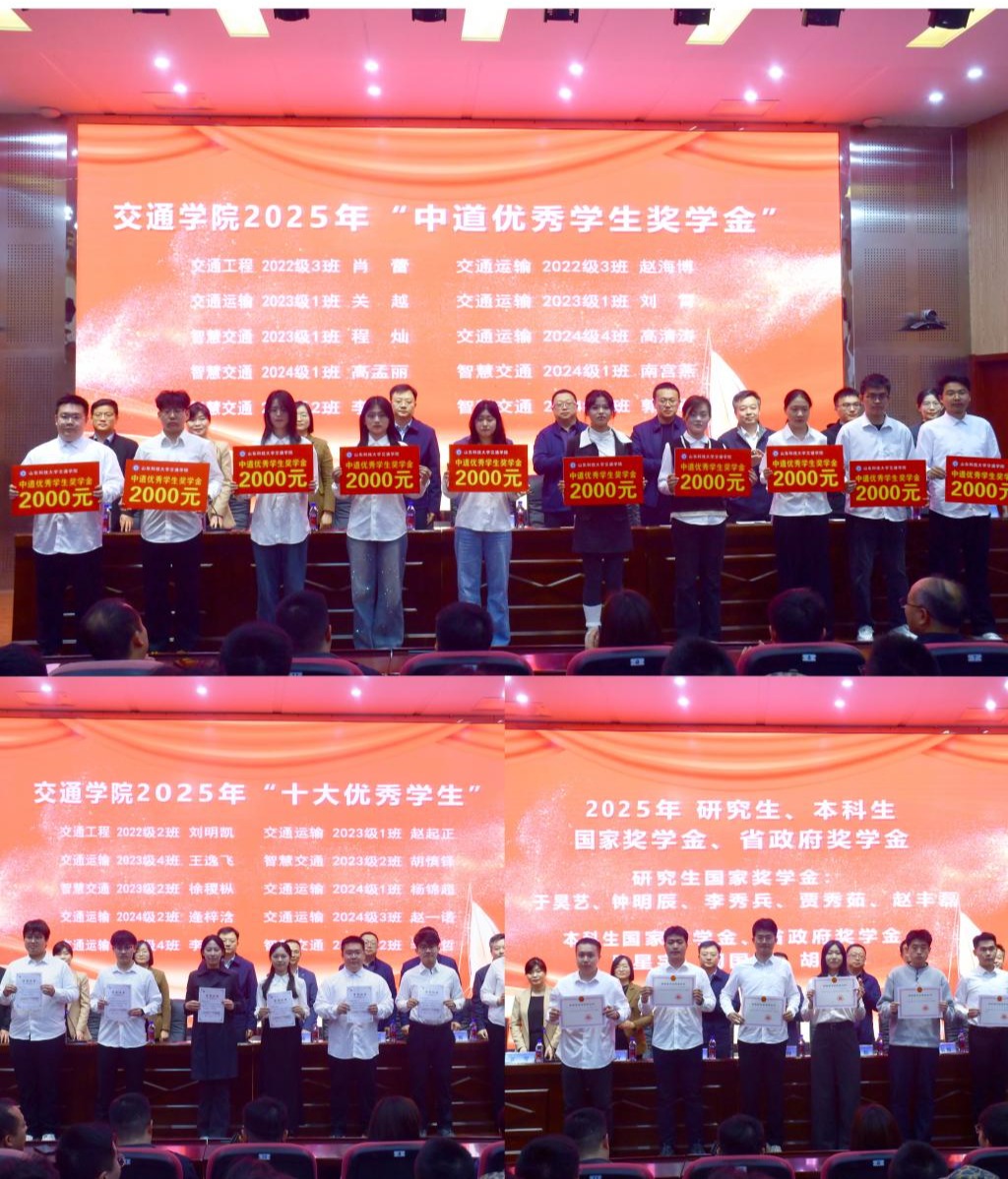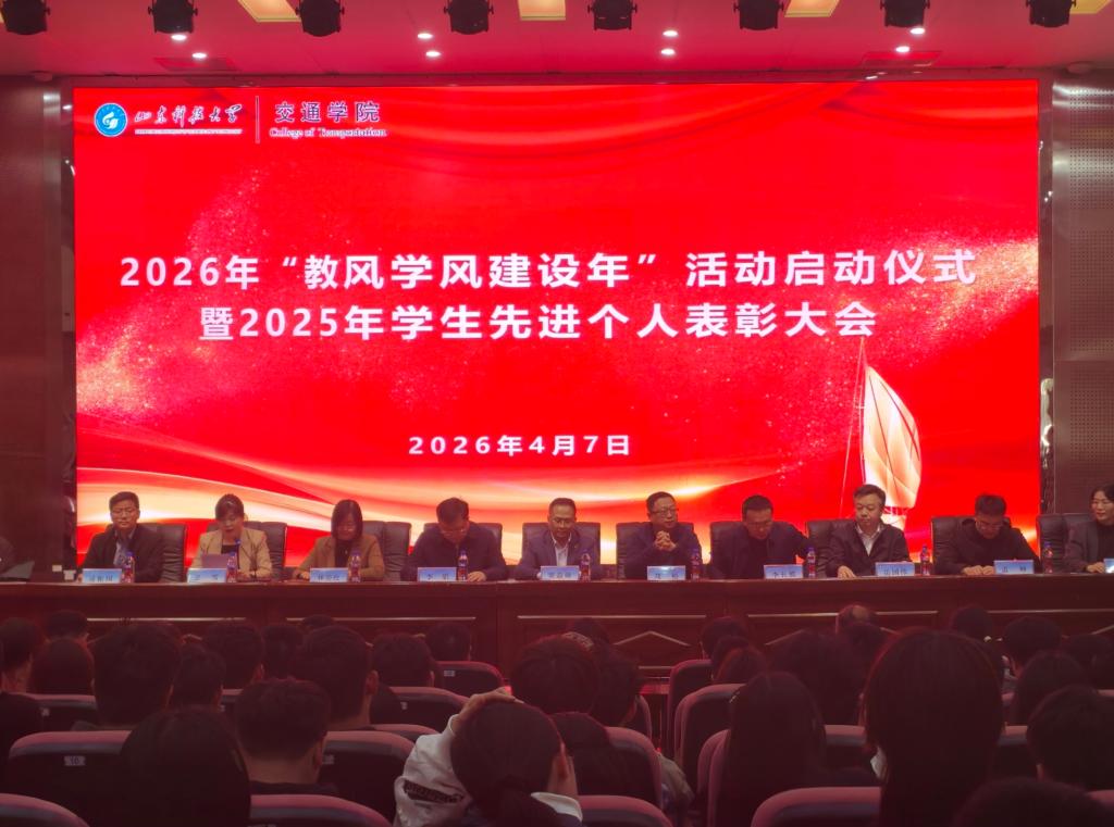 为进一步发挥榜样育人作用,营造学院优良教风和学风,4月7日,交通学院2026年“教风学风建设年”活动启动仪式暨2025年学生先进个人表彰大会在J9-144报告厅举行。交通学院理事单位、山东中道消防设备有限公司总经理窦益帅、学生工作处副处长刘松、教务处副处长李朋、研究生院副院长李长熙、合作发展处副处长林美玫和交通学院领导班子成员出席大会,会议由学院党委副书记兼副院长卫雪主持。