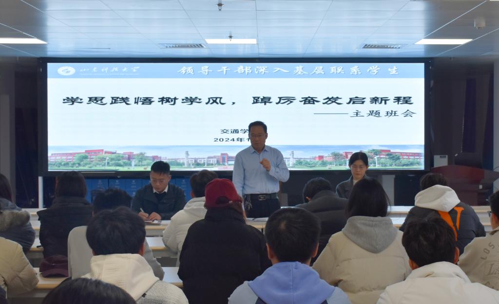 为贯彻落实领导干部深入基层联系学生制度,推进学院的学风建设,12月6日,交通学院院长辛嵩走进交通运输2024级2班,召开“学思践悟树学风,踔厉奋发启新程”主题班会,交通学院学生工作办公室主任刘倩婧、2024级新生辅导员任泳兆参加会议。