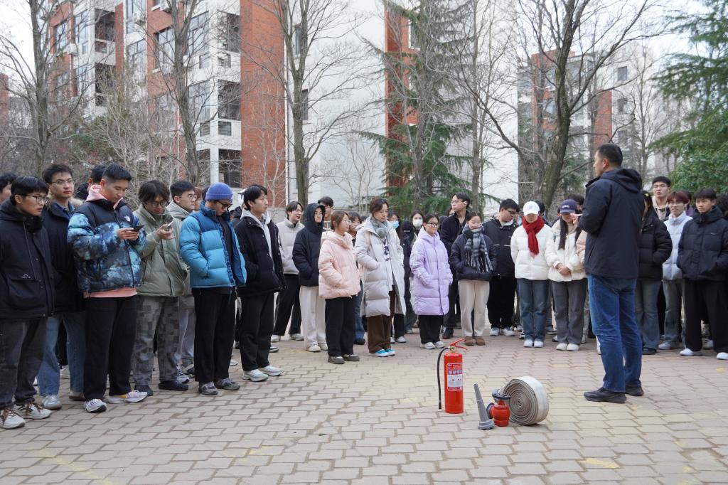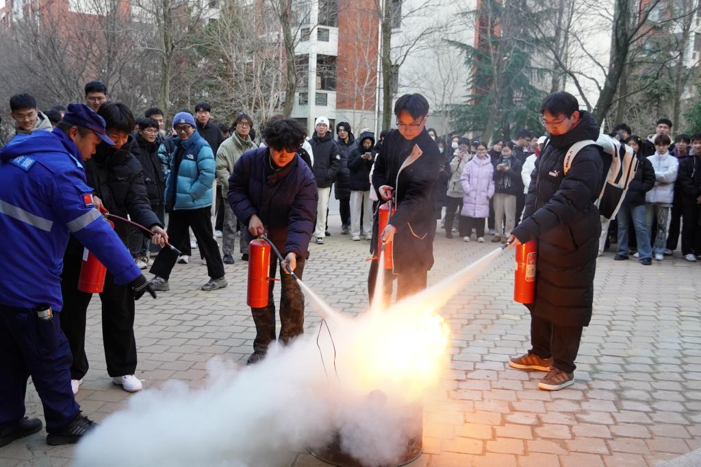 演练前,邵建华向学生们系统培训了逃生注意事项,讲解了火场逃生的基本方法,包括熟悉逃生路线、保持冷静、低姿前进、用湿毛巾捂住口鼻等。随后,他实地演示了消防栓、灭火器、灭火毯等消防器材的使用方法,并现场展示消防水带连接与灭火操作流程。最后,在安保人员的陪同与专业指导下,学生们踊跃参与,亲身体验使用灭火器灭火的整个流程,有效掌握了消防器材的使用技巧。