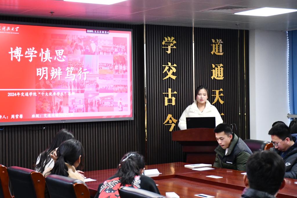 经个人申请、班级推荐、初审初评等环节,12名优秀学生脱颖而出,晋级答辩环节。答辩过程中,候选人围绕思想品德、专业学习、科研创新、学生工作、社会实践与个人荣誉等方面进行了事迹展示,以详实的数据、生动的事例、自信的姿态展现个人风采、分享成长感悟,让评委与观众深切感受到他们在逐梦路上的不懈坚持与拼搏精神,也彰显了交通学子的良好精神风貌。